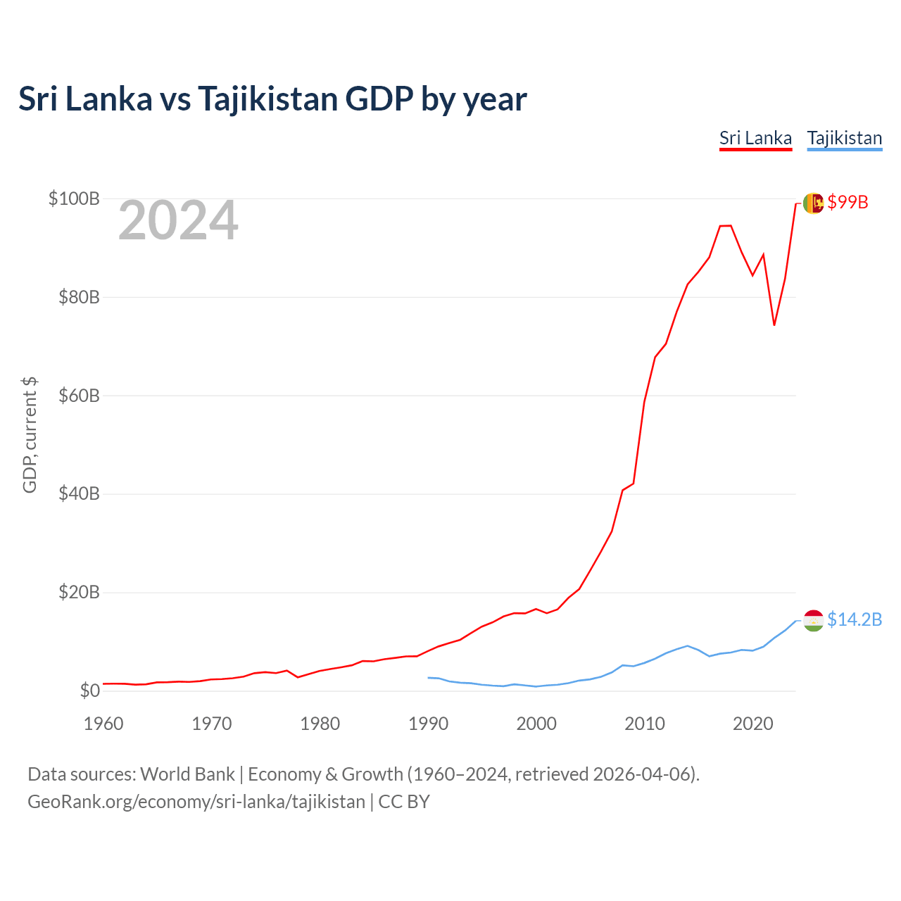 Sri Lanka has a GDP of $99B compared to $14.2B for Tajikistan, ranking 72/197 and 145/197 by economy size, respectively.