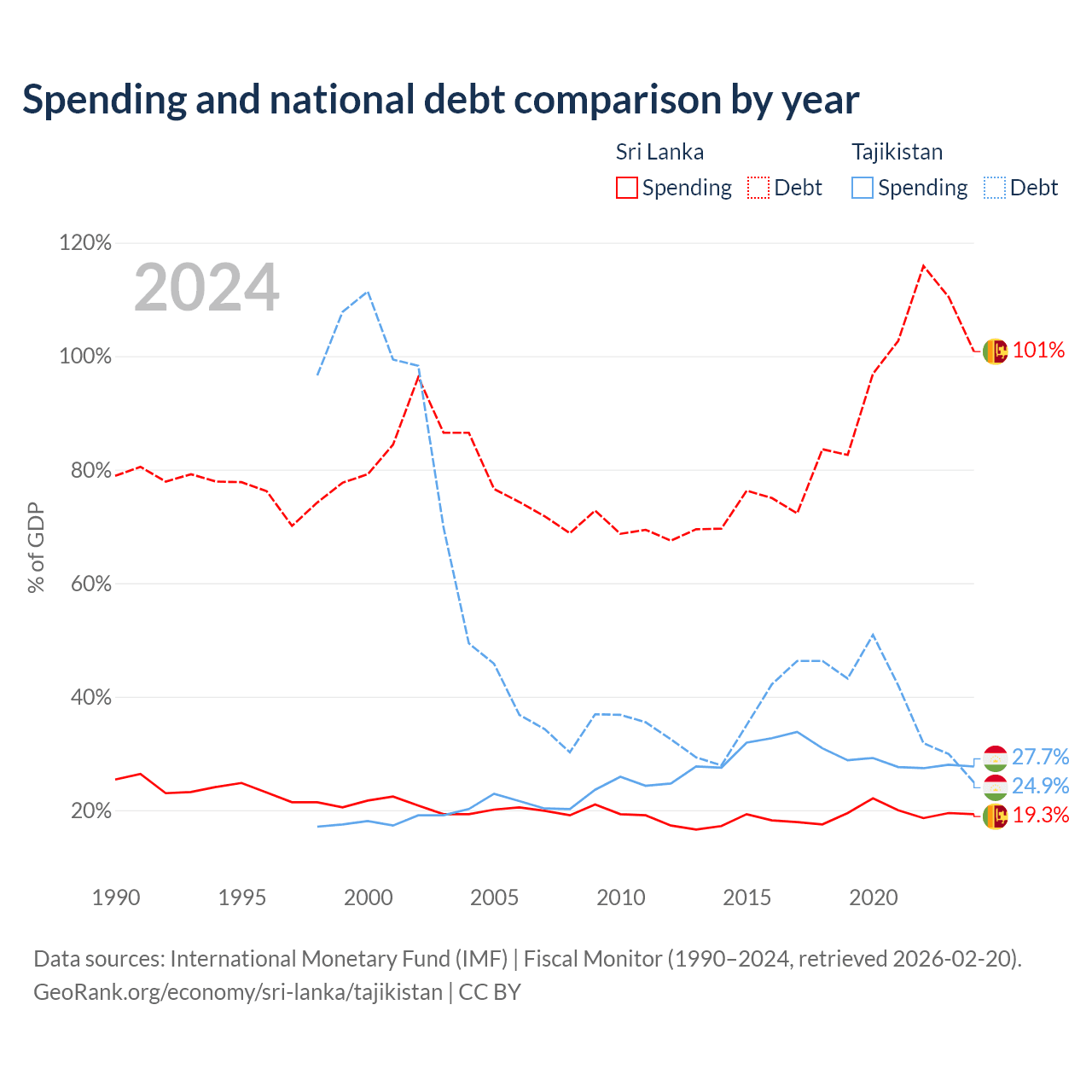 Sri Lanka has $99.8B in government debt (100.8% of GDP), compared to $3.54B (24.9% of GDP) in Tajikistan.