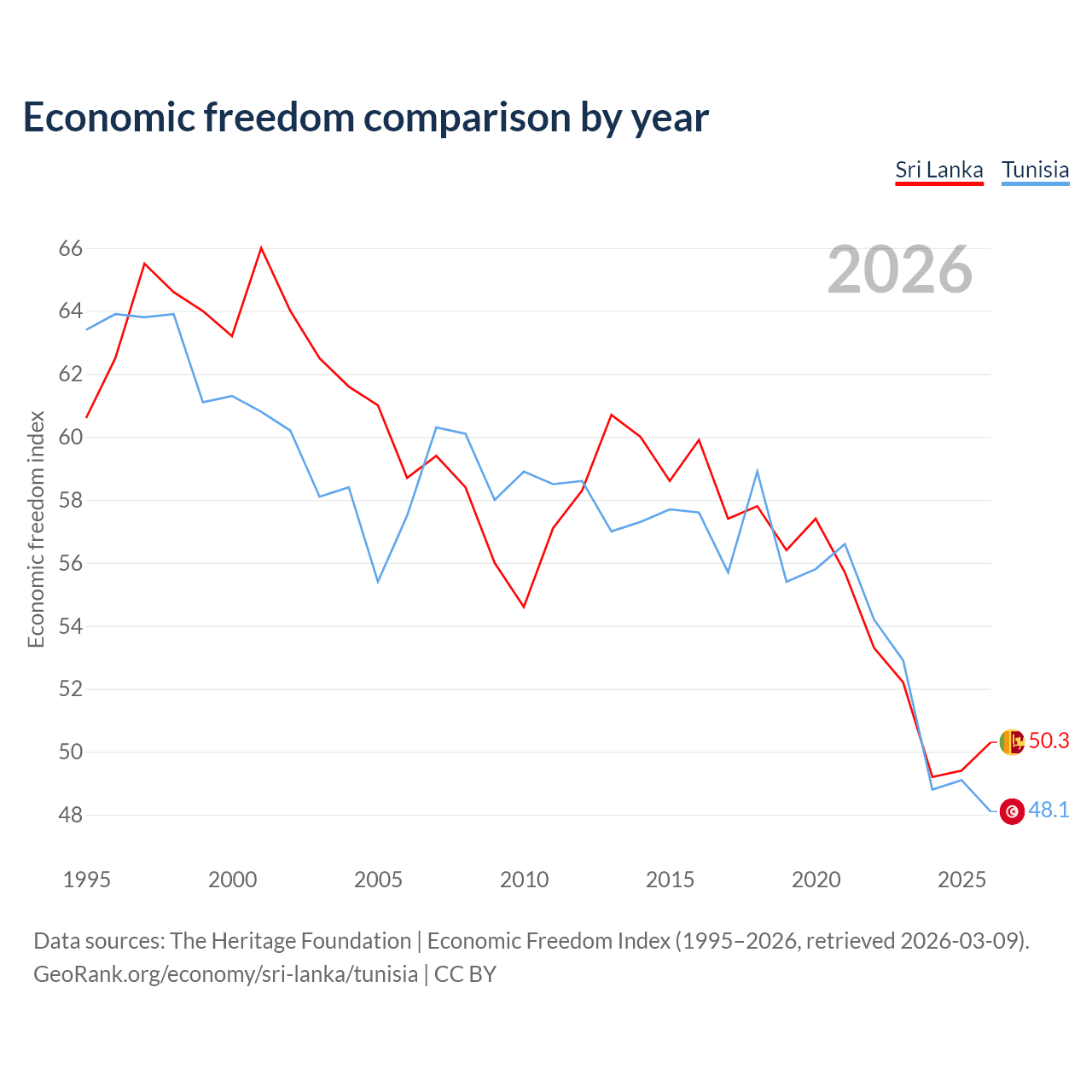 The Economic Freedom Index for Sri Lanka is 50.3, ranking 162/197, compared to 48.1 for Tunisia, ranking 172/197. The chart above displays a comparison of annual changes in economic freedom indexes.