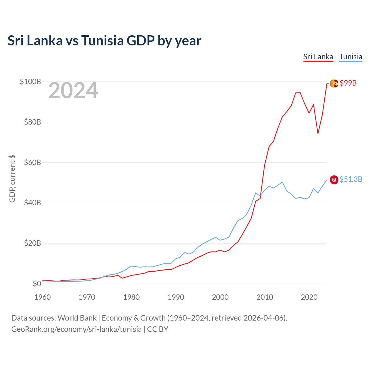 Sri Lanka has a GDP of $99B compared to $51.3B for Tunisia, ranking 72/197 and 93/197 by economy size, respectively.