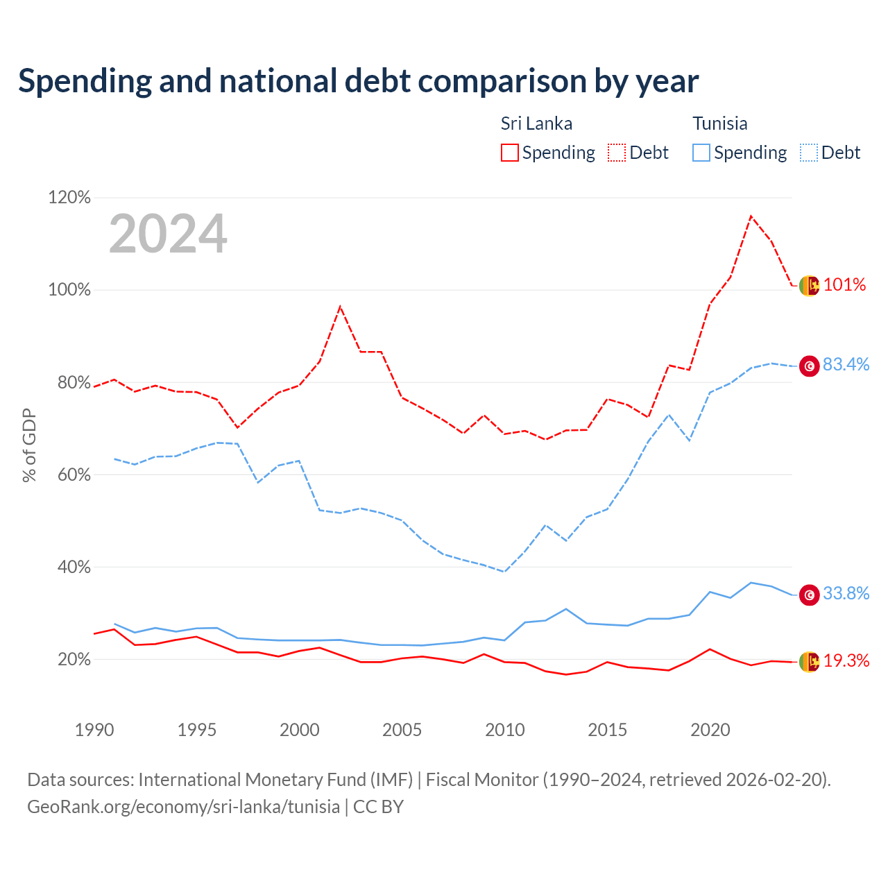 Sri Lanka has $99.8B in government debt (100.8% of GDP), compared to $42.8B (83.4% of GDP) in Tunisia.