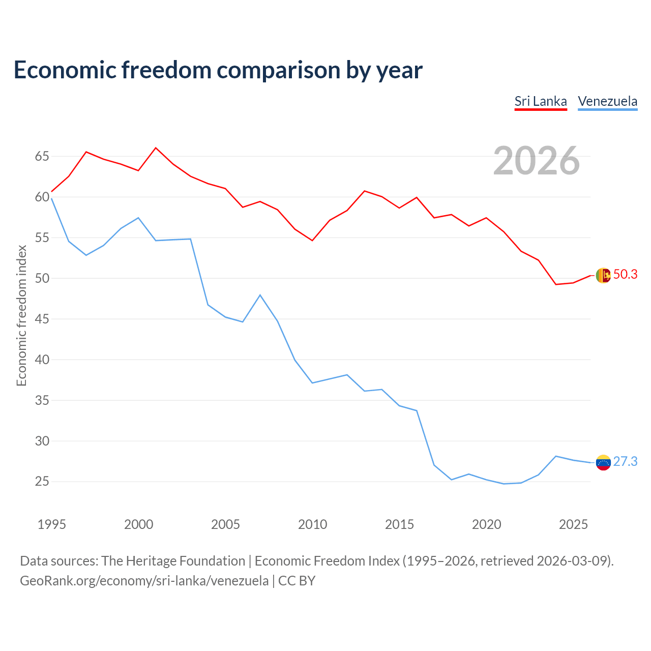 The Economic Freedom Index for Sri Lanka is 50.3, ranking 162/197, compared to 27.3 for Venezuela, ranking 194/197. The chart above displays a comparison of annual changes in economic freedom indexes.