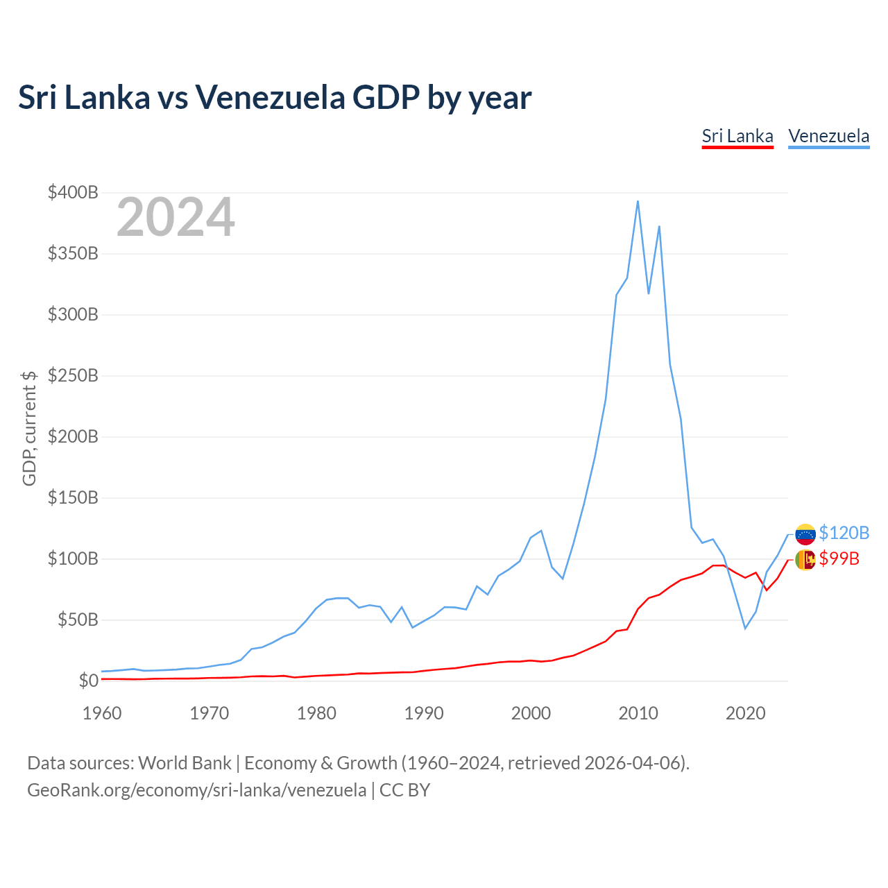 Sri Lanka has a GDP of $99B compared to $120B for Venezuela, ranking 72/197 and 65/197 by economy size, respectively.