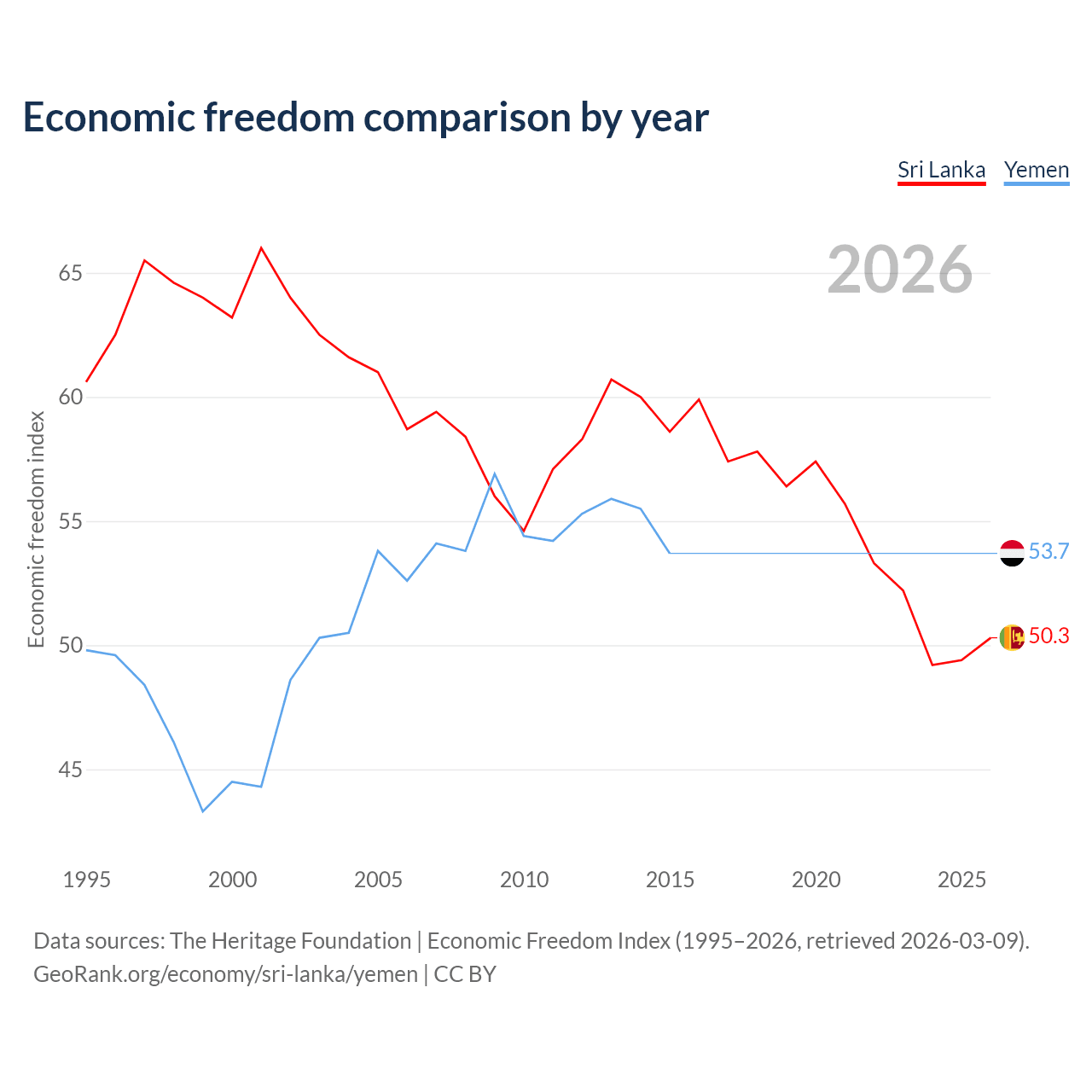 The Economic Freedom Index for Sri Lanka is 50.3, ranking 162/197, compared to 53.7 for Yemen, ranking 138/197. The chart above displays a comparison of annual changes in economic freedom indexes.