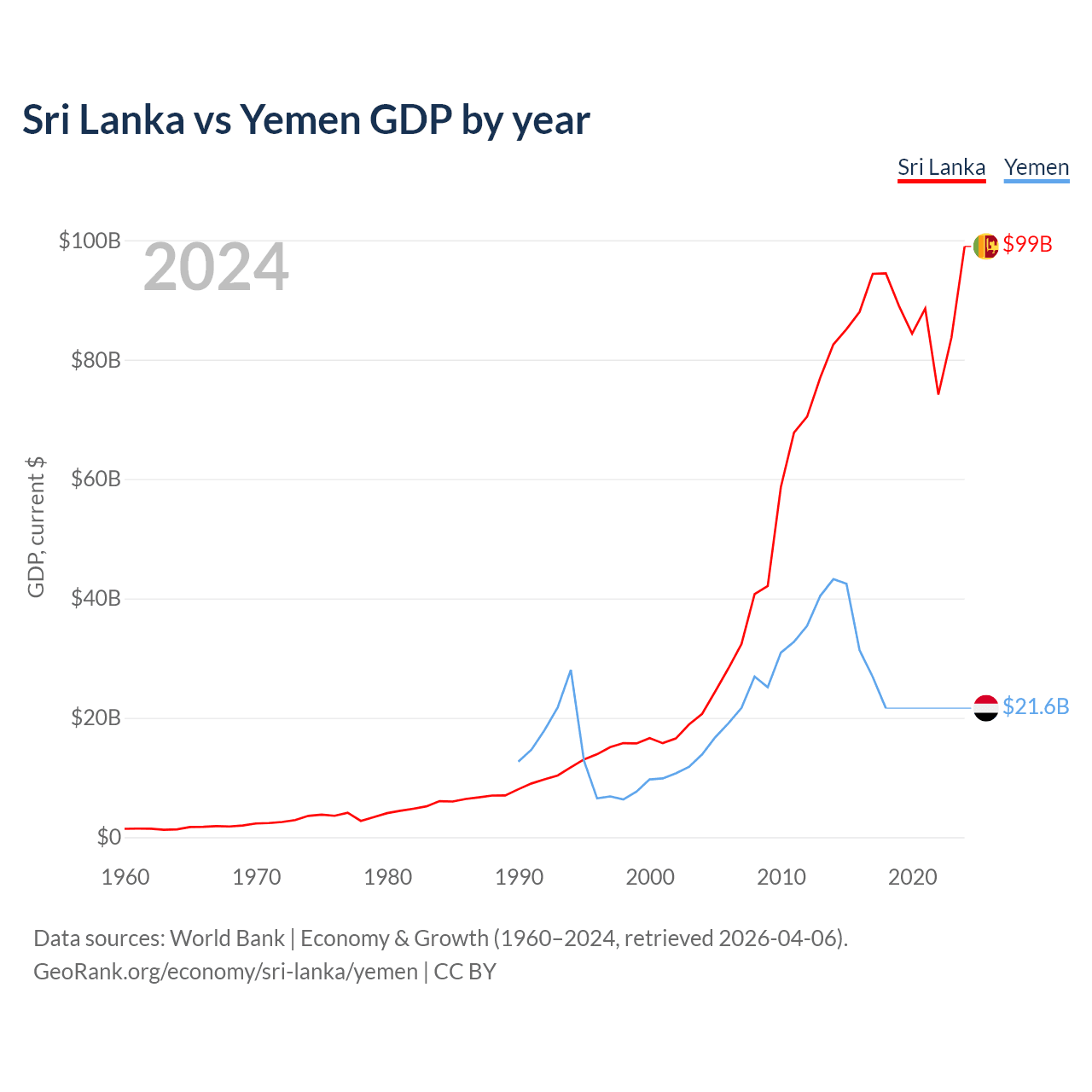 Sri Lanka has a GDP of $99B compared to $21.6B for Yemen, ranking 72/197 and 125/197 by economy size, respectively.
