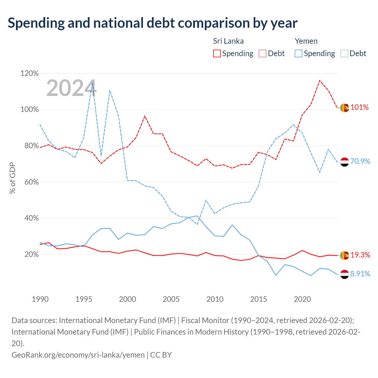 Sri Lanka has $99.8B in government debt (100.8% of GDP), compared to $18.8B (70.9% of GDP) in Yemen.