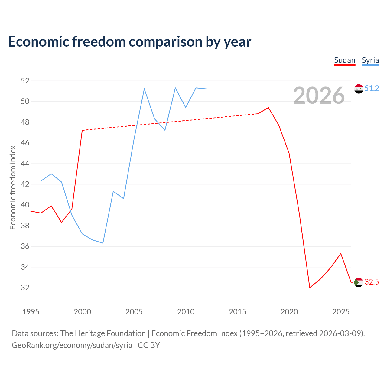 The Economic Freedom Index for Sudan is 32.5, ranking 191/197, compared to 51.2 for Syria, ranking 155/197. The chart above displays a comparison of annual changes in economic freedom indexes.