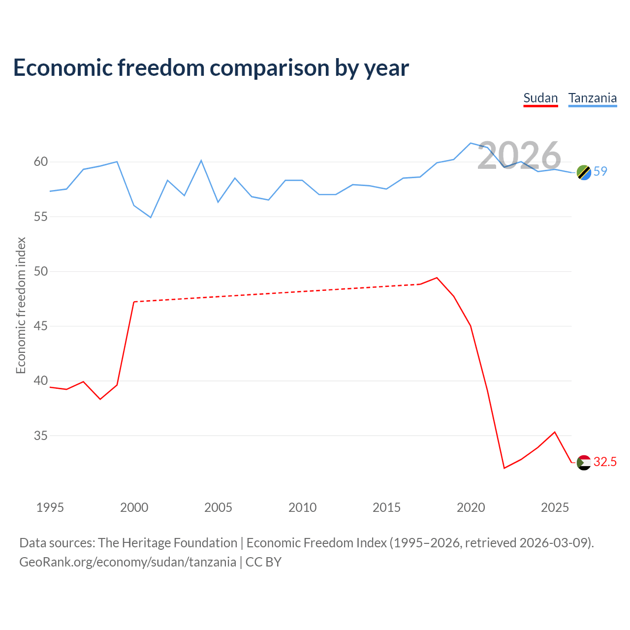 The Economic Freedom Index for Sudan is 32.5, ranking 191/197, compared to 59 for Tanzania, ranking 106/197. The chart above displays a comparison of annual changes in economic freedom indexes.