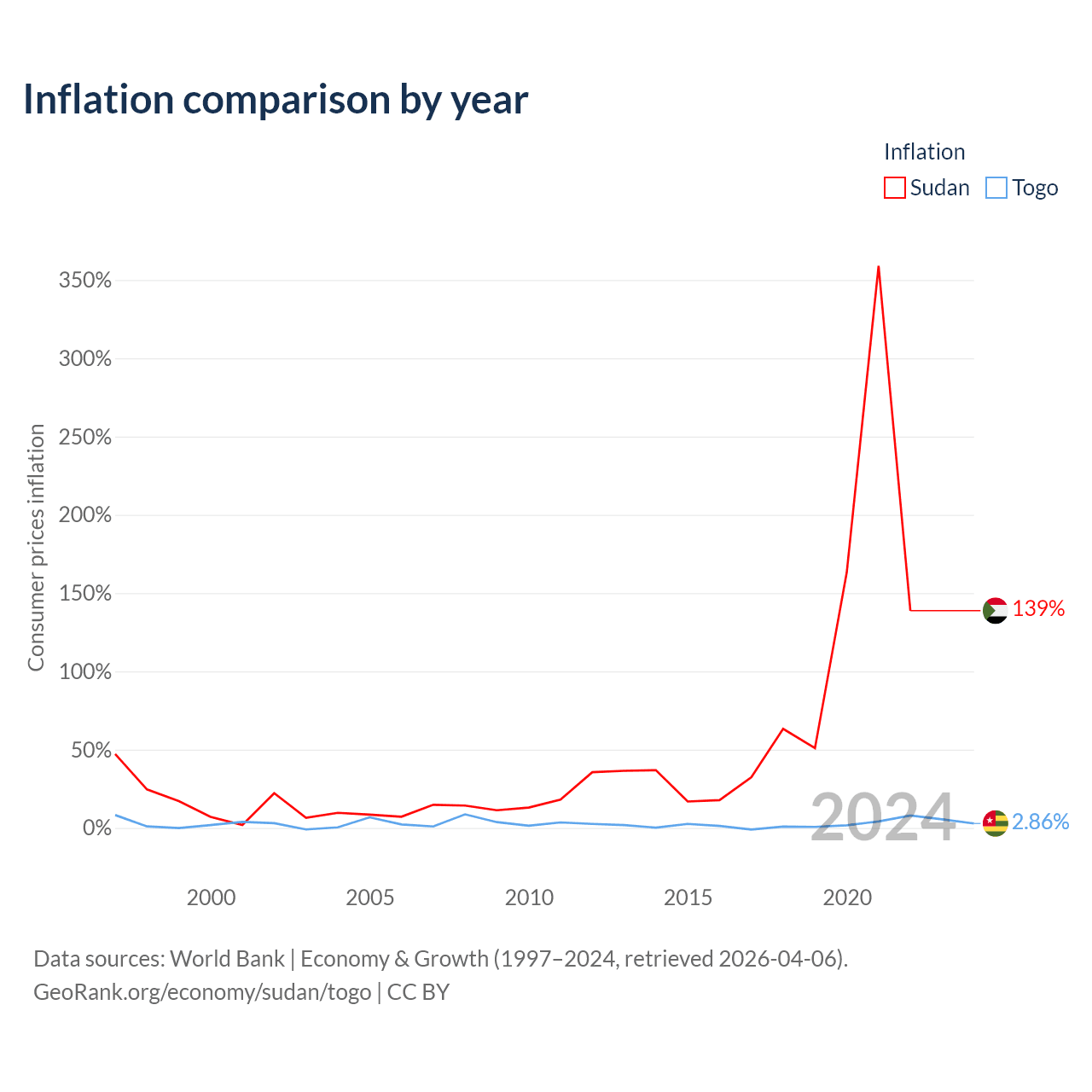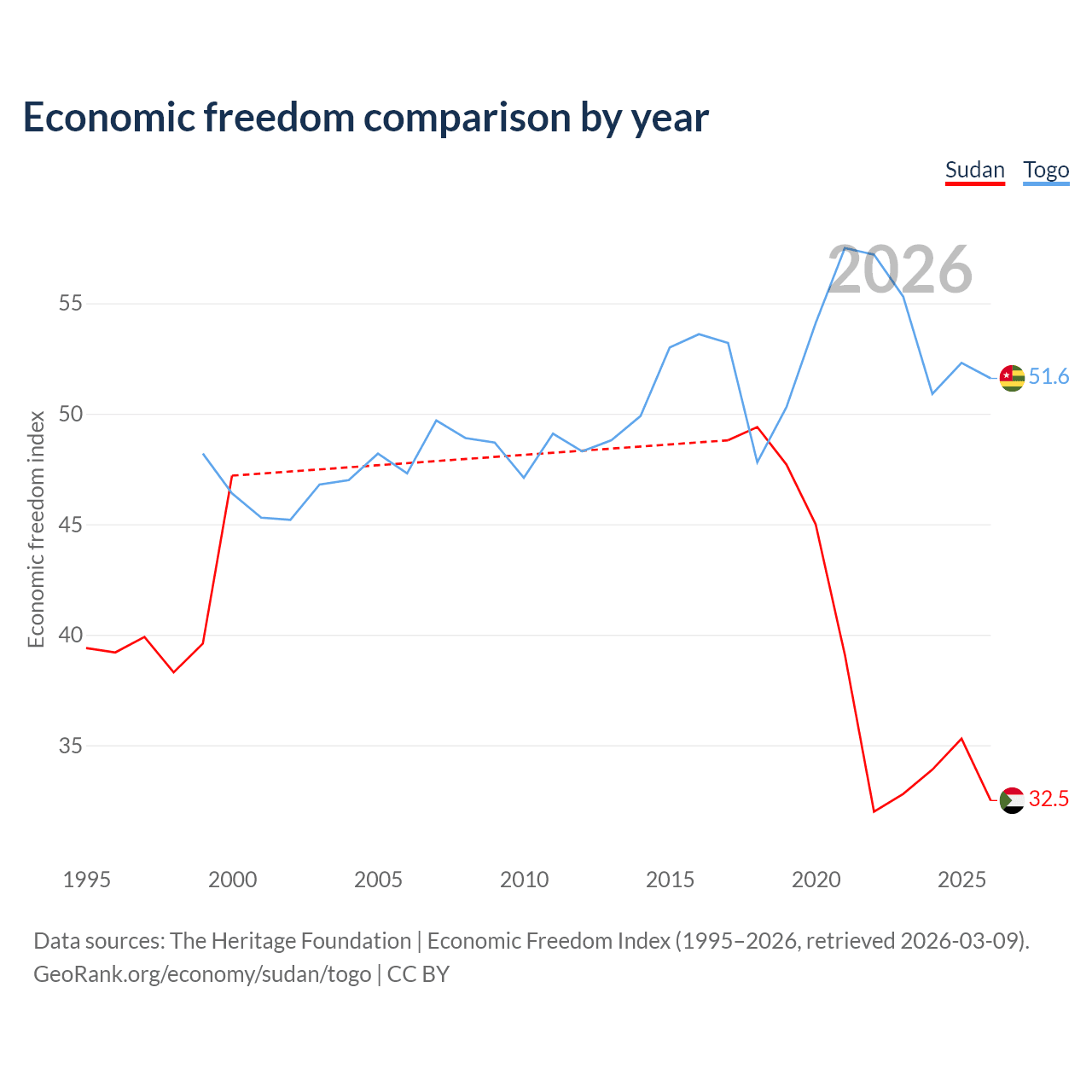 The Economic Freedom Index for Sudan is 32.5, ranking 191/197, compared to 51.6 for Togo, ranking 153/197. The chart above displays a comparison of annual changes in economic freedom indexes.