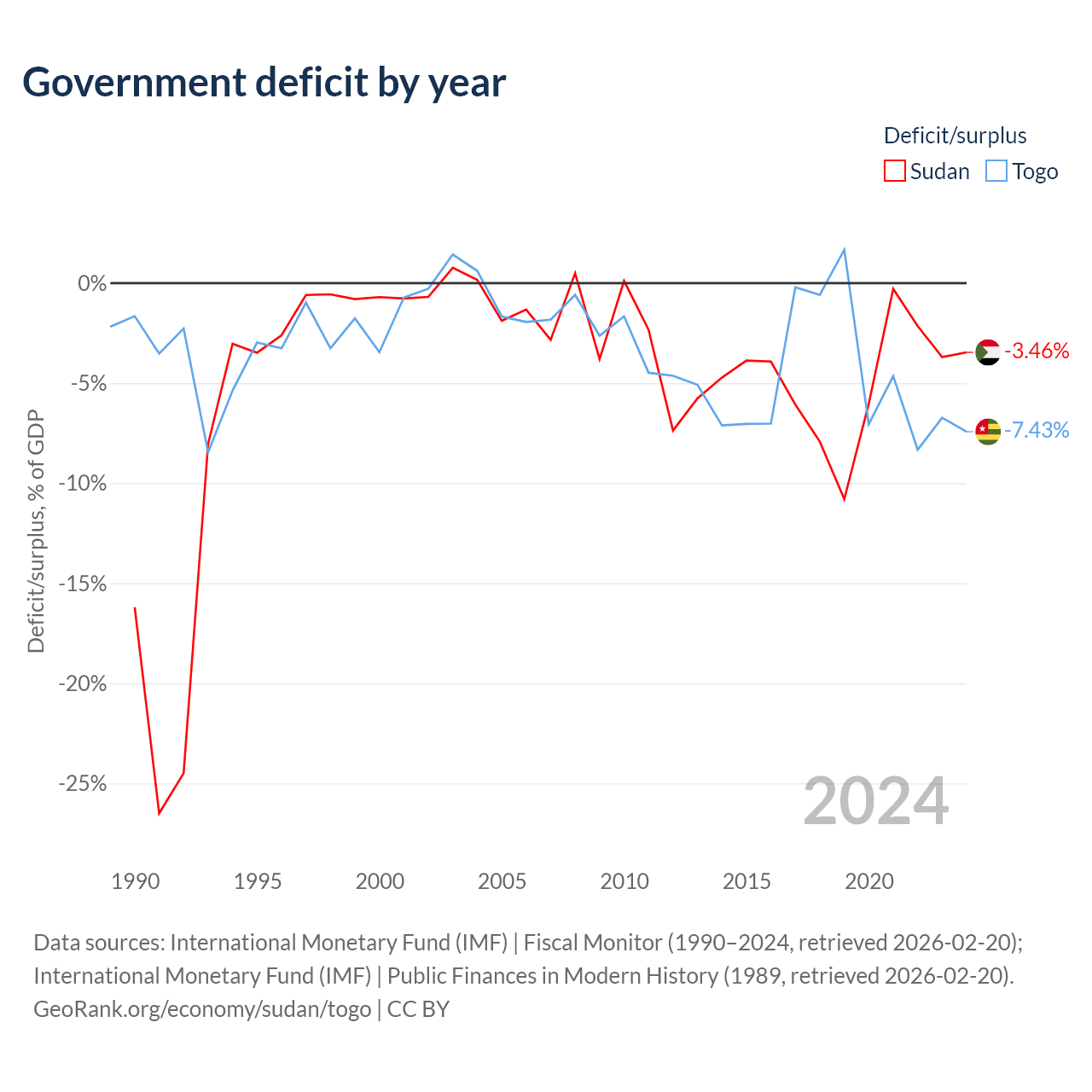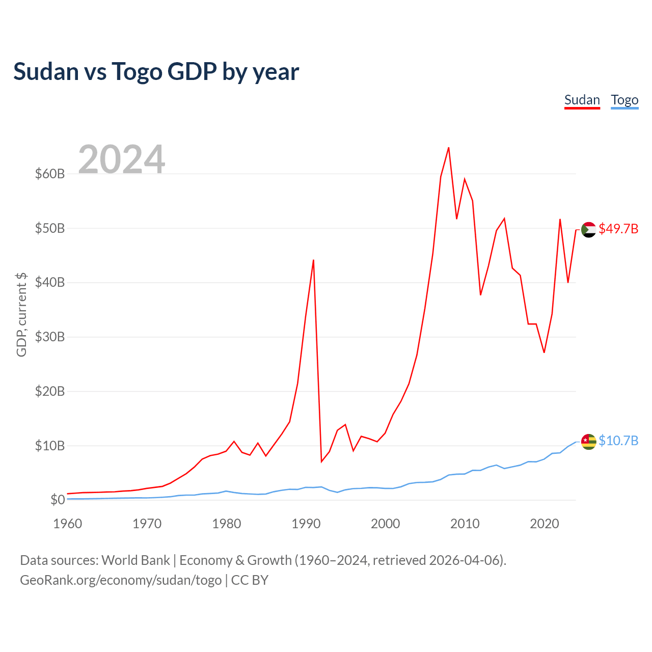 Sudan has a GDP of $49.7B compared to $10.7B for Togo, ranking 94/197 and 154/197 by economy size, respectively.