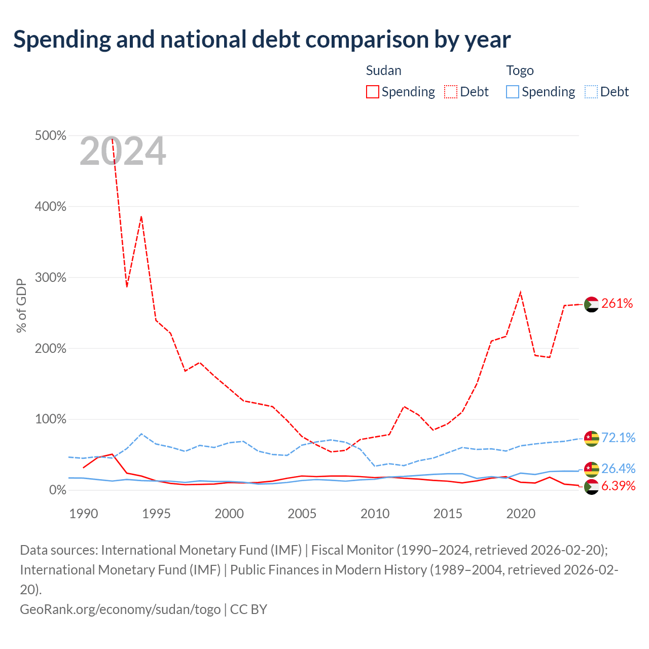 Sudan has $130B in government debt (261.4% of GDP), compared to $7.68B (72.1% of GDP) in Togo.