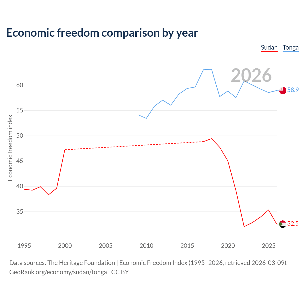 The Economic Freedom Index for Sudan is 32.5, ranking 191/197, compared to 58.9 for Tonga, ranking 107/197. The chart above displays a comparison of annual changes in economic freedom indexes.