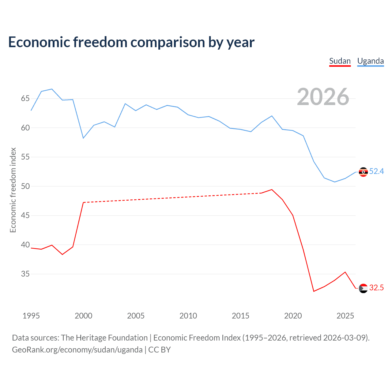 The Economic Freedom Index for Sudan is 32.5, ranking 191/197, compared to 52.4 for Uganda, ranking 149/197. The chart above displays a comparison of annual changes in economic freedom indexes.