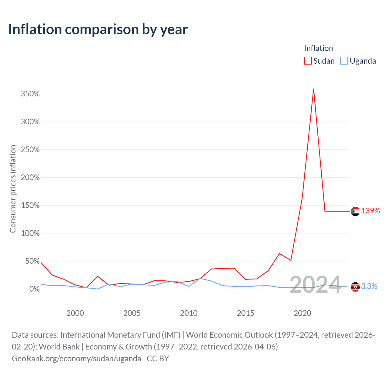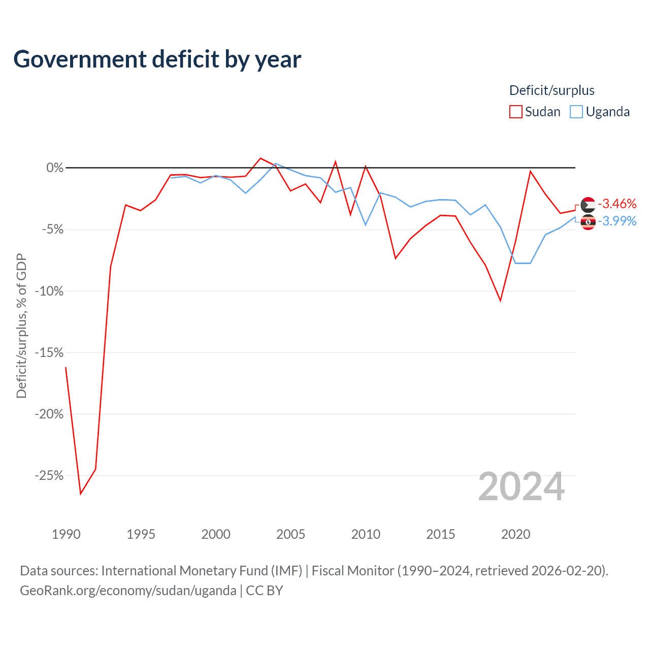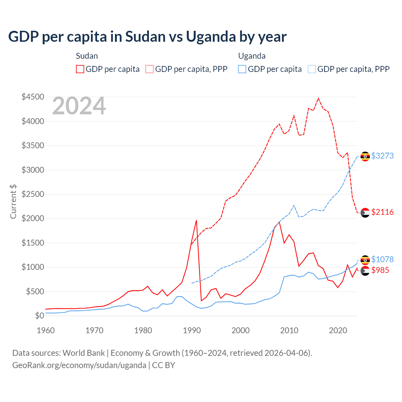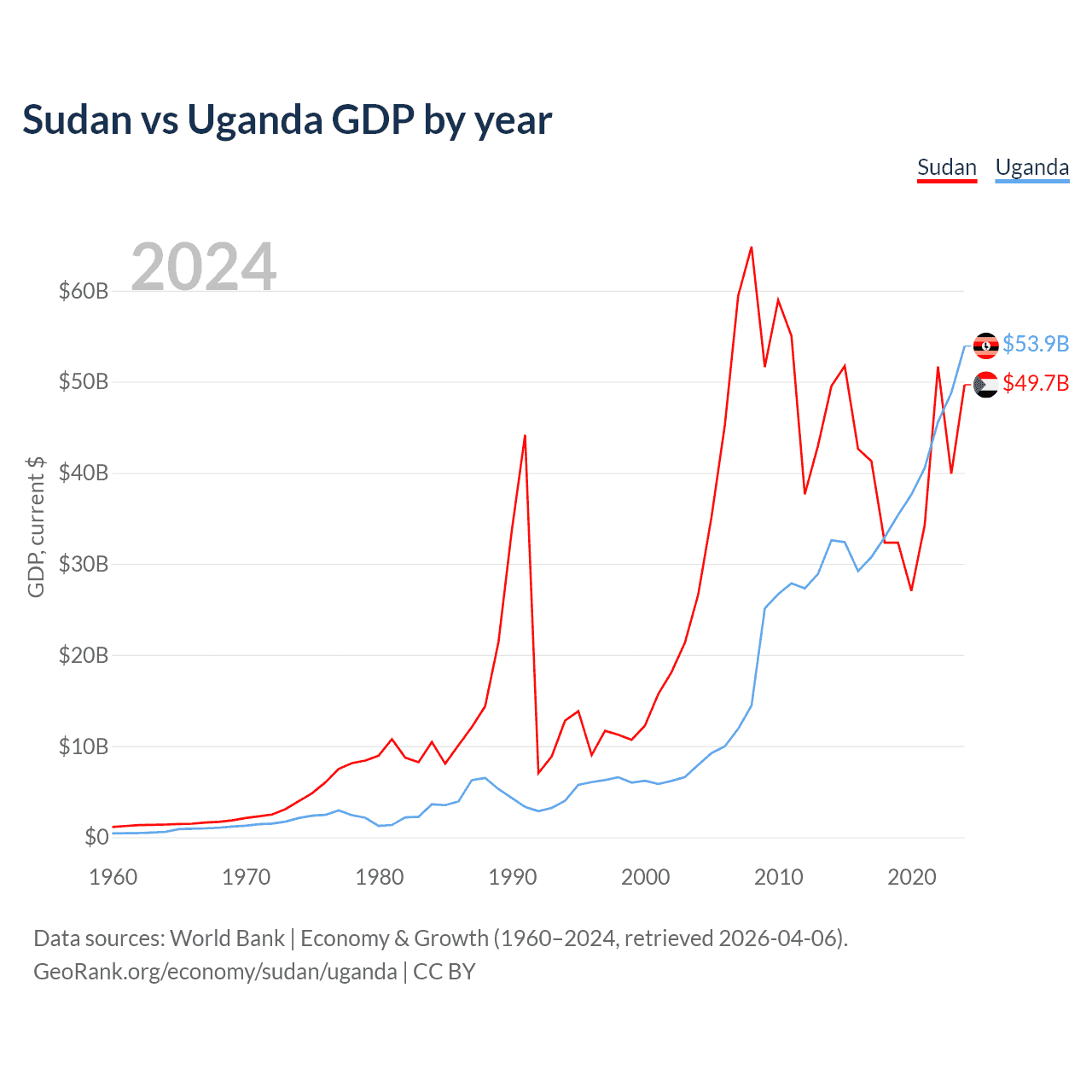 Sudan has a GDP of $49.7B compared to $53.9B for Uganda, ranking 94/197 and 89/197 by economy size, respectively.