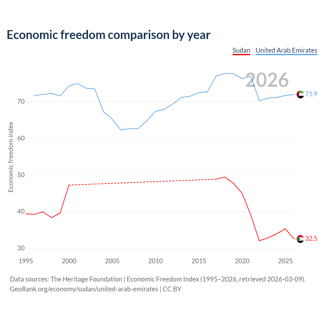 The Economic Freedom Index for Sudan is 32.5, ranking 191/197, compared to 71.9 for the United Arab Emirates, ranking 29/197. The chart above displays a comparison of annual changes in economic freedom indexes.