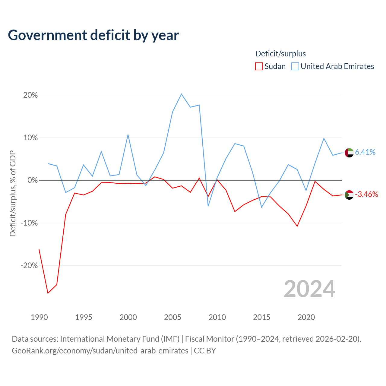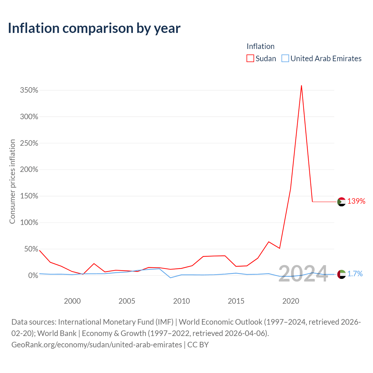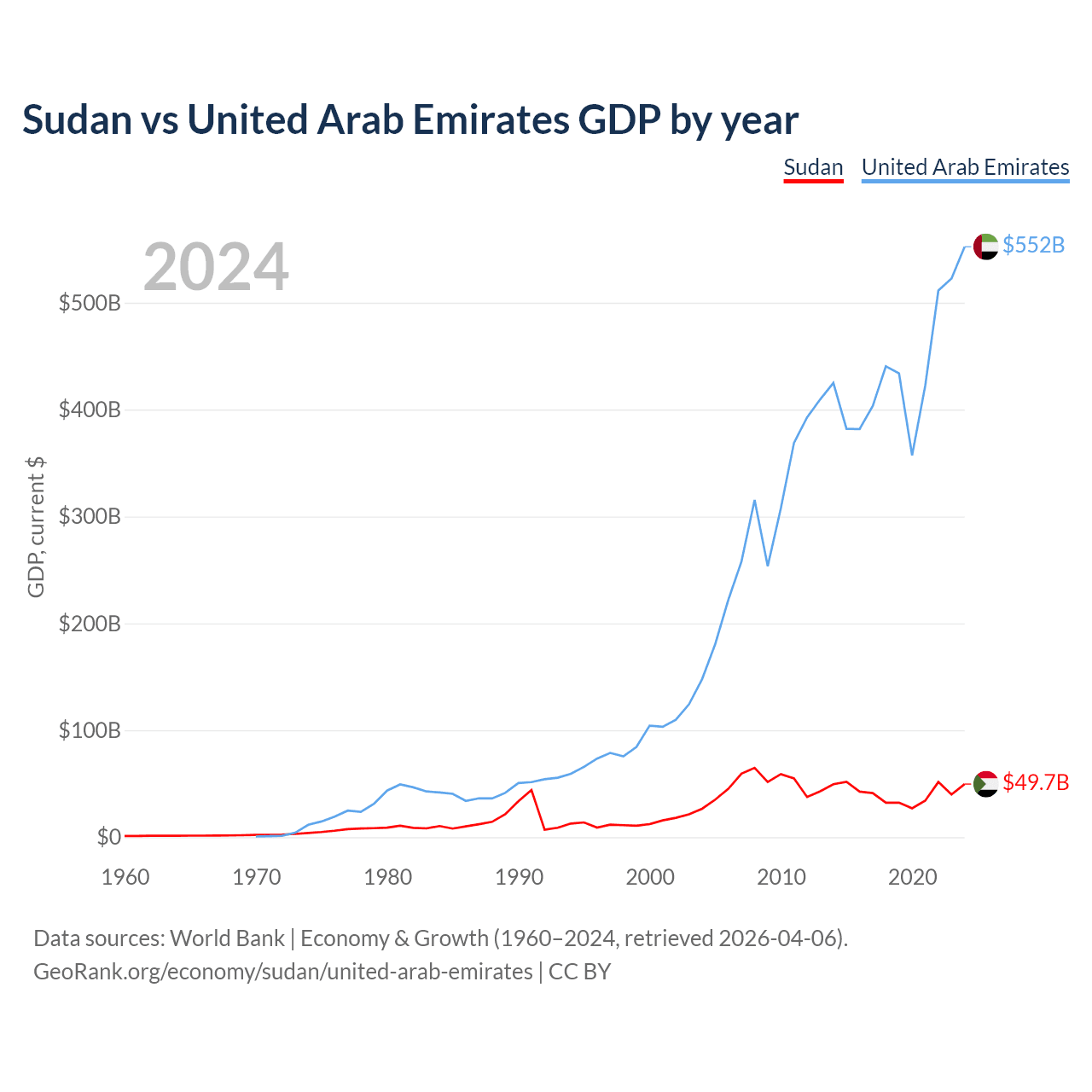 Sudan has a GDP of $49.7B compared to $552B for the United Arab Emirates, ranking 94/197 and 27/197 by economy size, respectively.