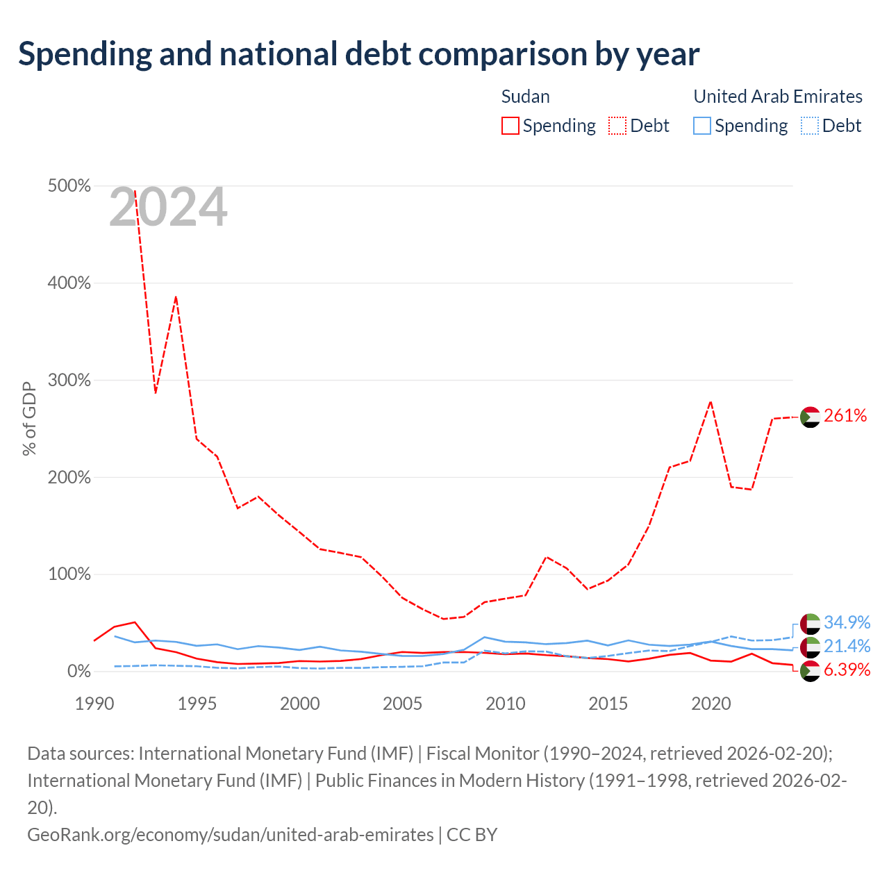Sudan has $130B in government debt (261.4% of GDP), compared to $193B (34.9% of GDP) in the United Arab Emirates.