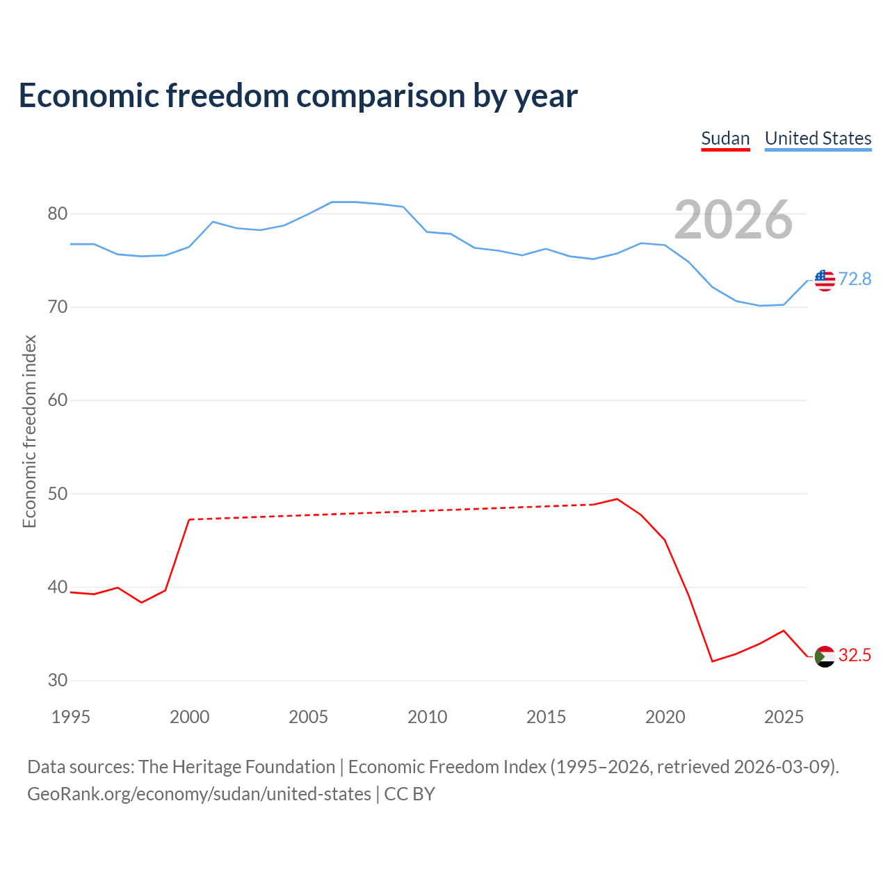 The Economic Freedom Index for Sudan is 32.5, ranking 191/197, compared to 72.8 for the United States, ranking 27/197. The chart above displays a comparison of annual changes in economic freedom indexes.