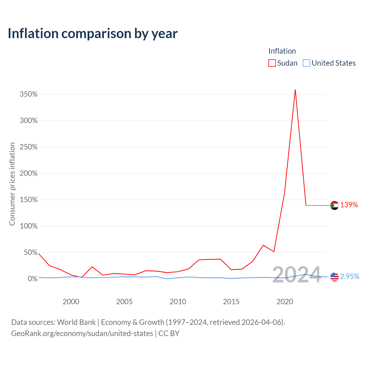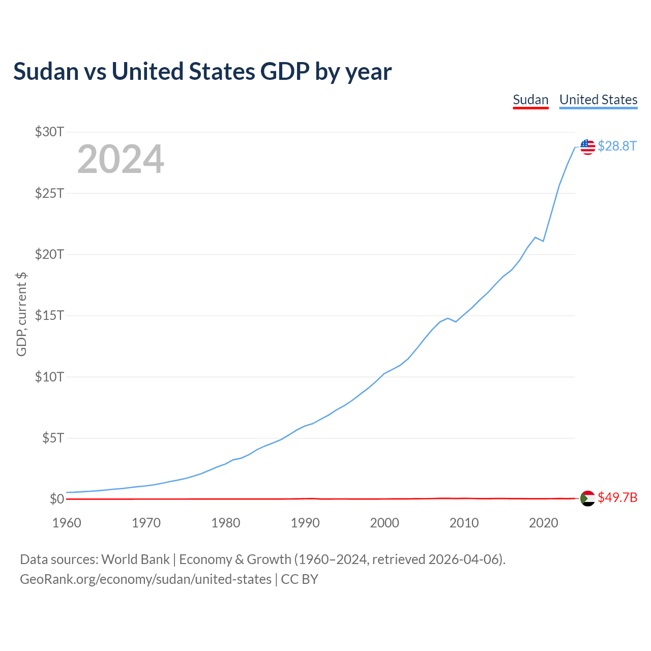 Sudan has a GDP of $49.7B compared to $28.8T for the United States, ranking 94/197 and 1/197 by economy size, respectively.