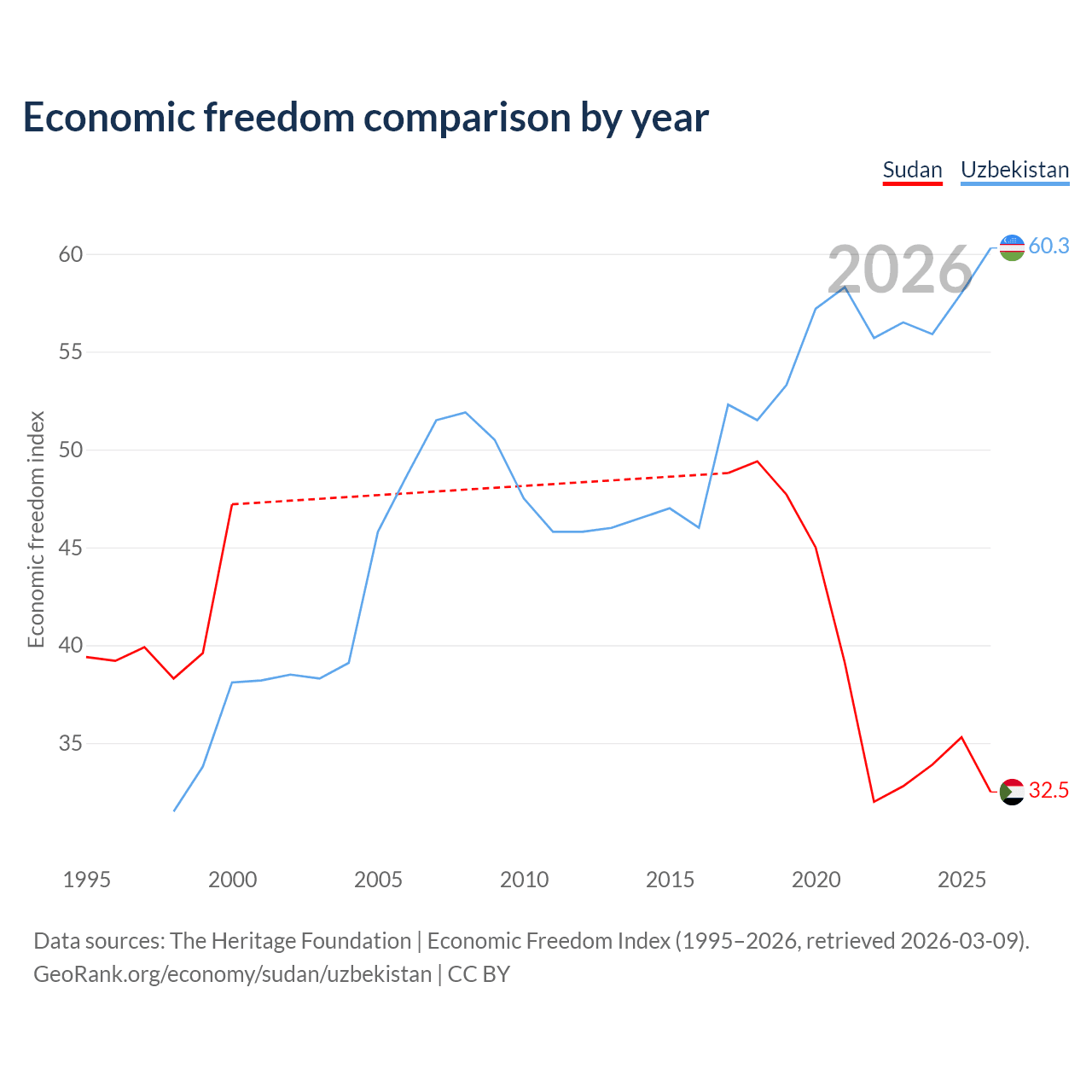 The Economic Freedom Index for Sudan is 32.5, ranking 191/197, compared to 60.3 for Uzbekistan, ranking 94/197. The chart above displays a comparison of annual changes in economic freedom indexes.