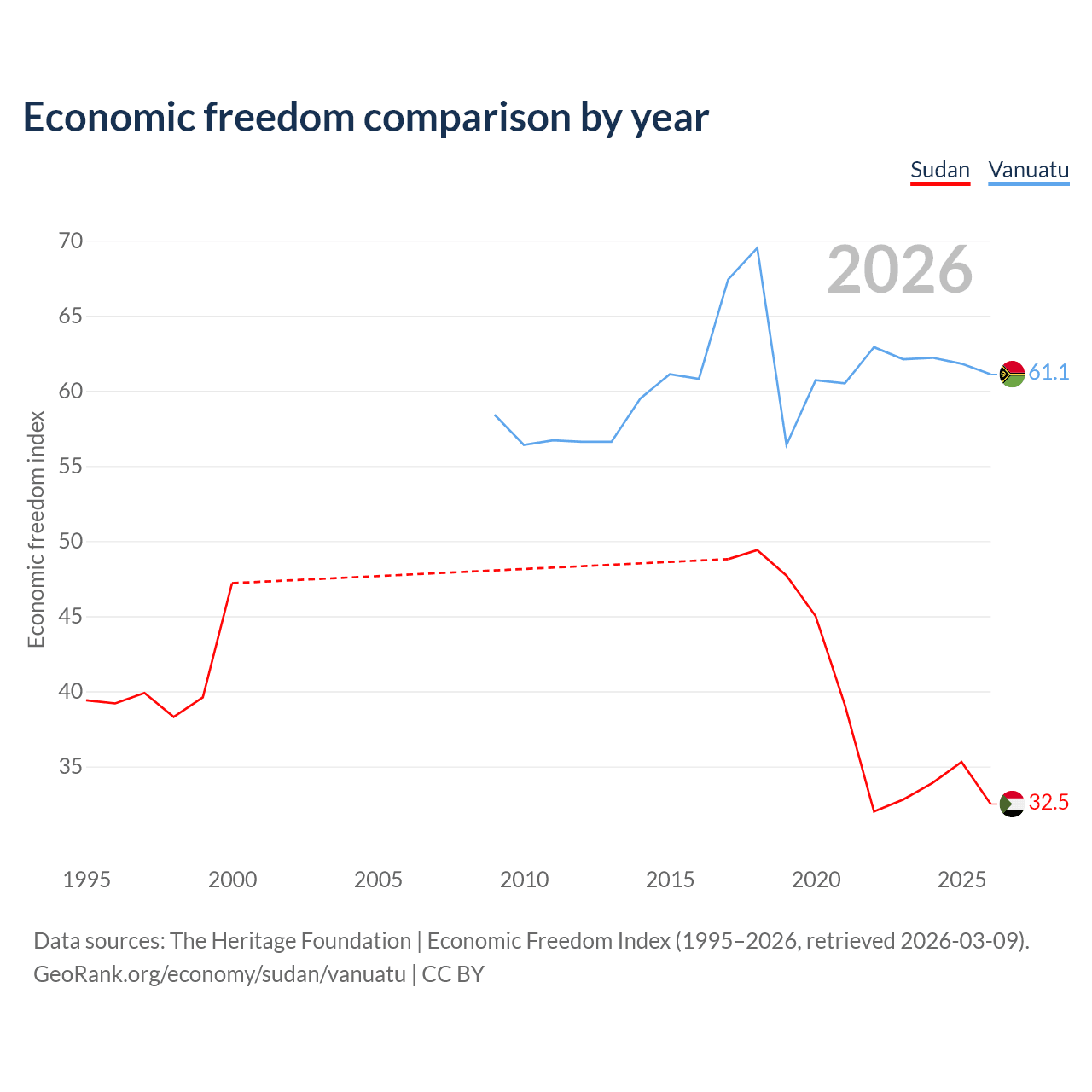 The Economic Freedom Index for Sudan is 32.5, ranking 191/197, compared to 61.1 for Vanuatu, ranking 92/197. The chart above displays a comparison of annual changes in economic freedom indexes.