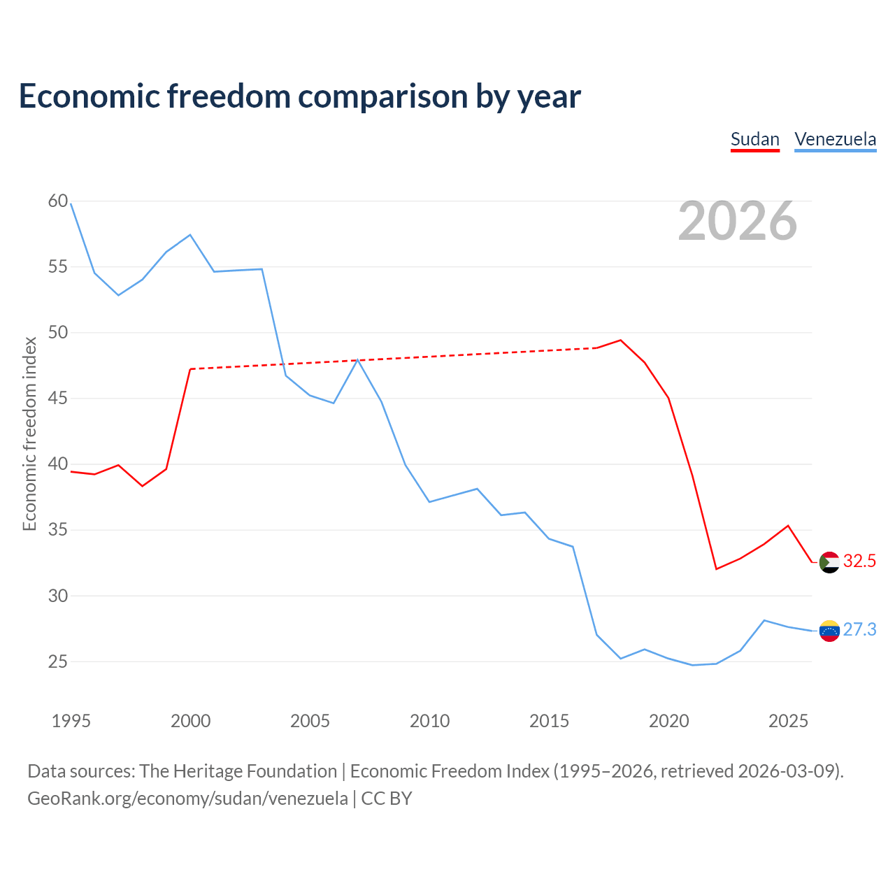 The Economic Freedom Index for Sudan is 32.5, ranking 191/197, compared to 27.3 for Venezuela, ranking 194/197. The chart above displays a comparison of annual changes in economic freedom indexes.