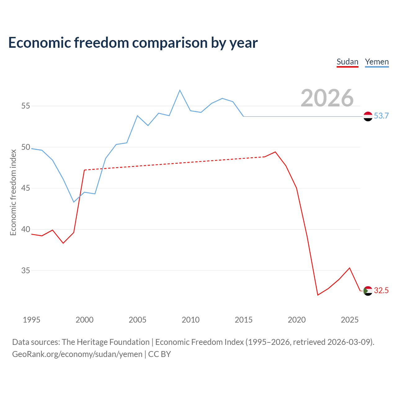 The Economic Freedom Index for Sudan is 32.5, ranking 191/197, compared to 53.7 for Yemen, ranking 138/197. The chart above displays a comparison of annual changes in economic freedom indexes.