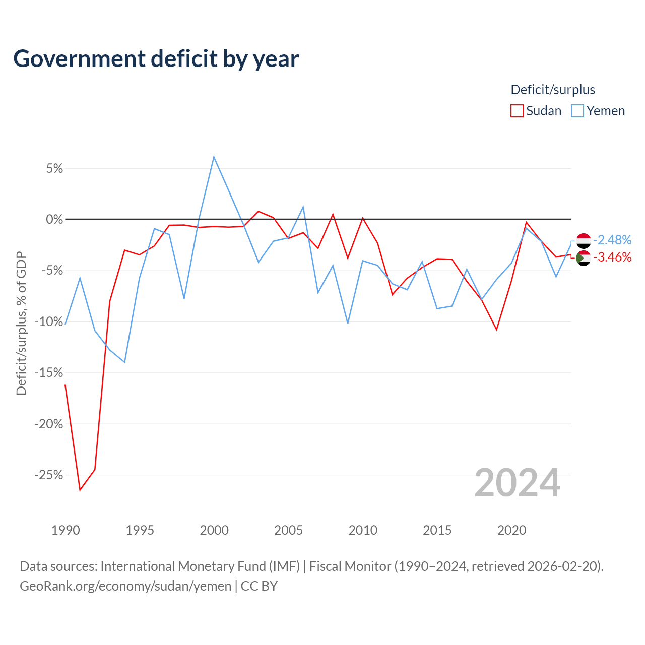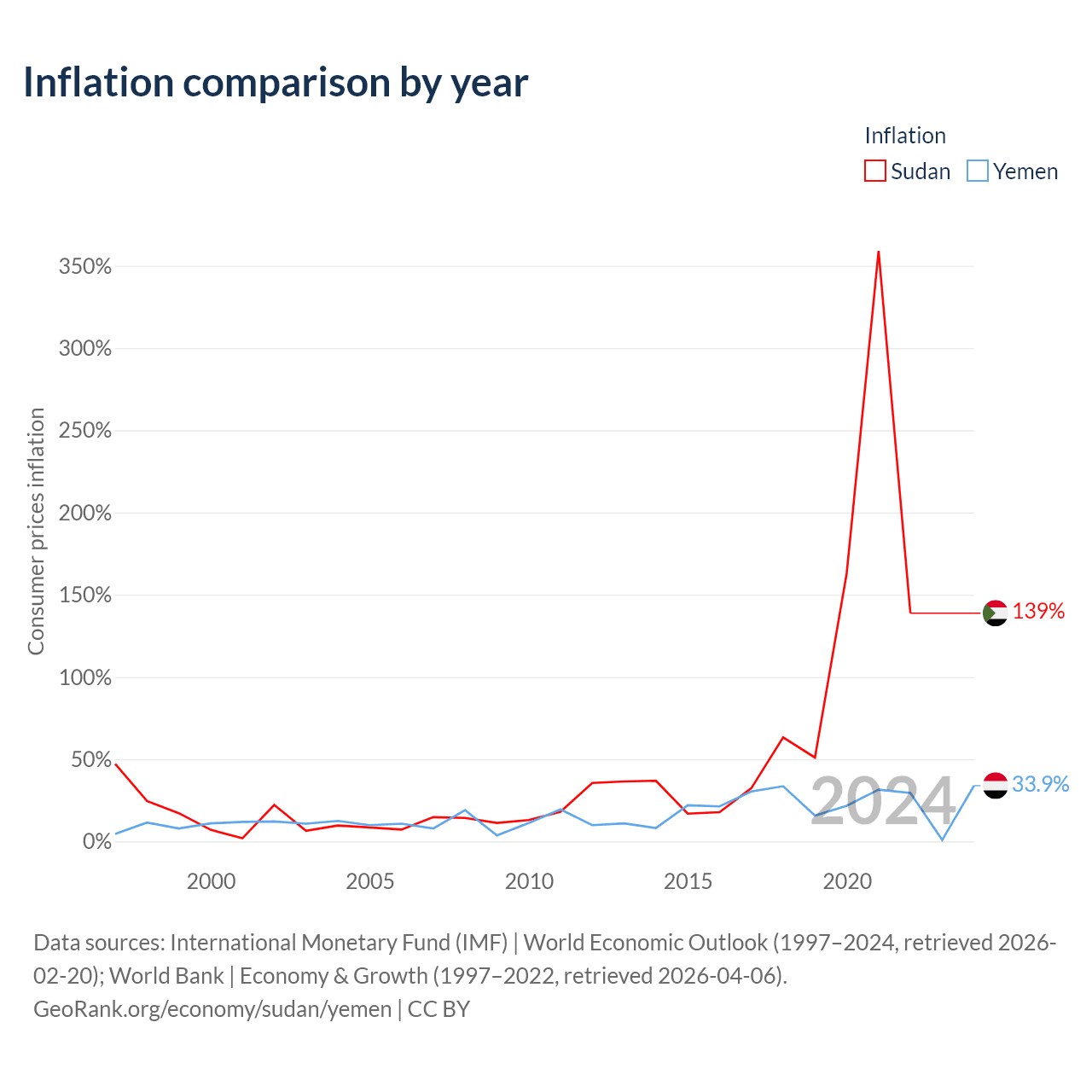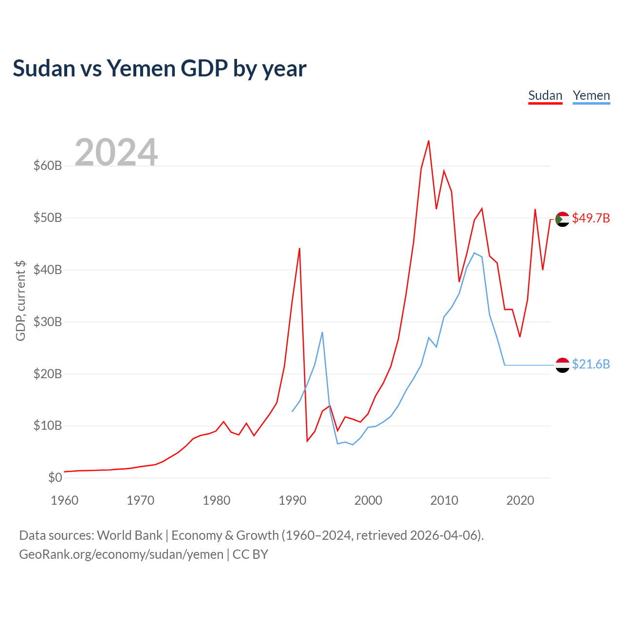 Sudan has a GDP of $49.7B compared to $21.6B for Yemen, ranking 94/197 and 125/197 by economy size, respectively.