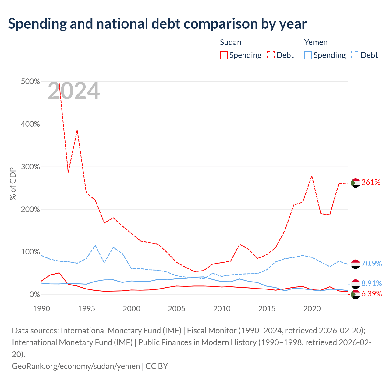 Sudan has $130B in government debt (261.4% of GDP), compared to $18.8B (70.9% of GDP) in Yemen.