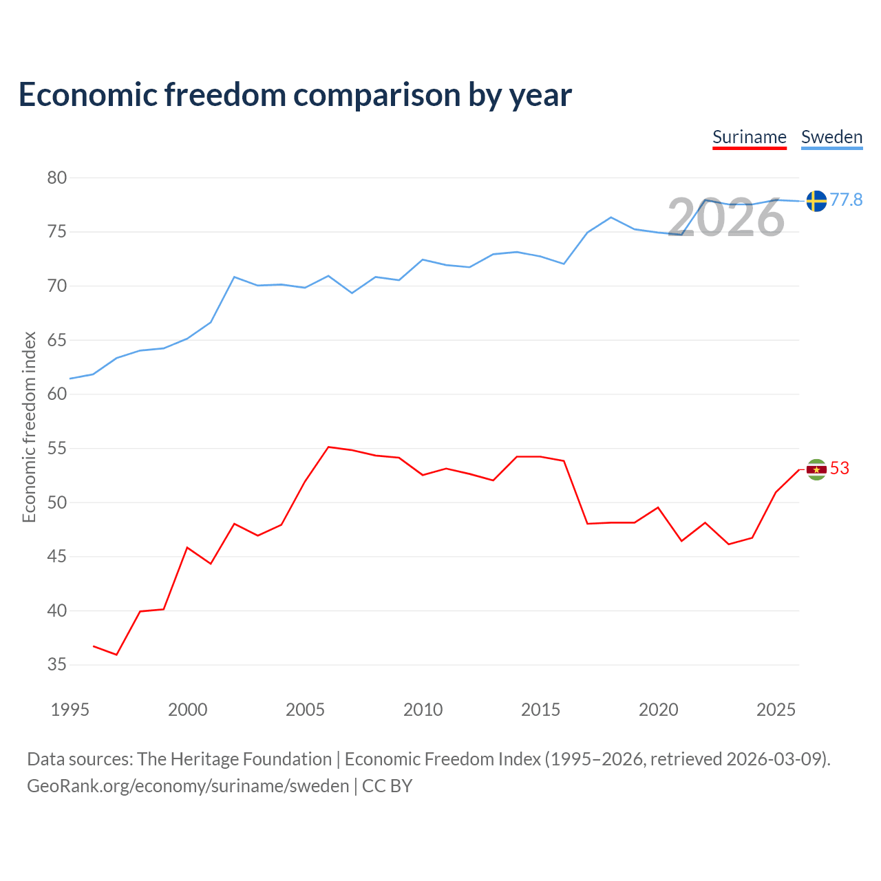 The Economic Freedom Index for Suriname is 53, ranking 143/197, compared to 77.8 for Sweden, ranking 14/197. The chart above displays a comparison of annual changes in economic freedom indexes.