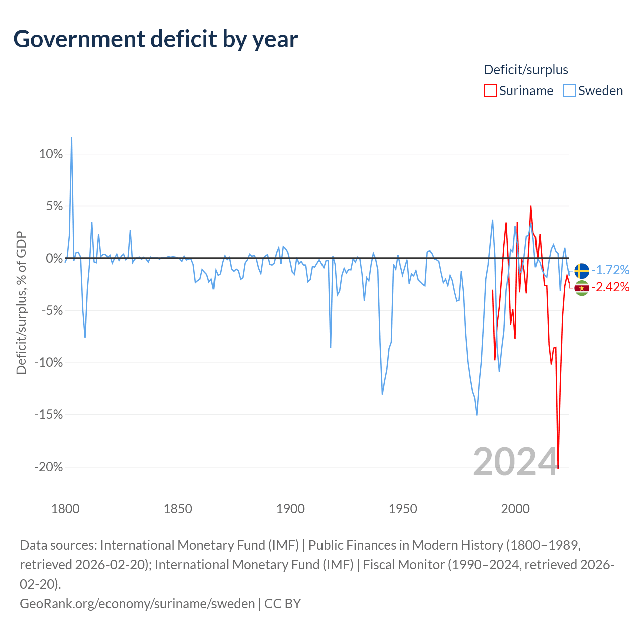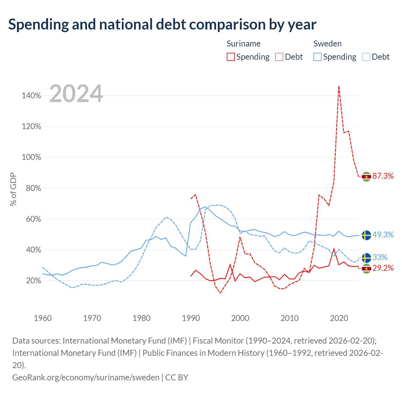 Suriname has $3.86B in government debt (87.3% of GDP), compared to $199B (33% of GDP) in Sweden.