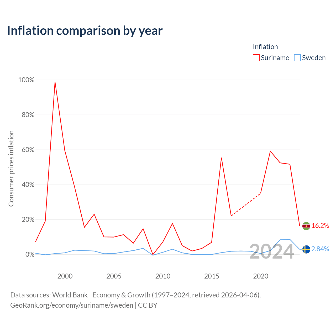 Suriname has a GDP of $4.42B compared to $604B for Sweden, ranking 164/197 and 26/197 by economy size, respectively.