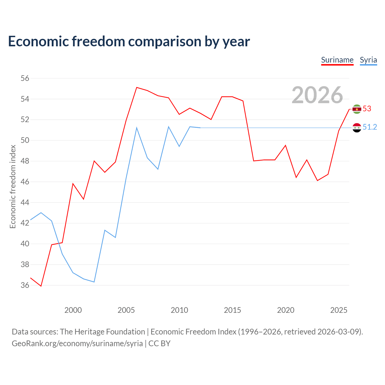 The Economic Freedom Index for Suriname is 53, ranking 143/197, compared to 51.2 for Syria, ranking 155/197. The chart above displays a comparison of annual changes in economic freedom indexes.