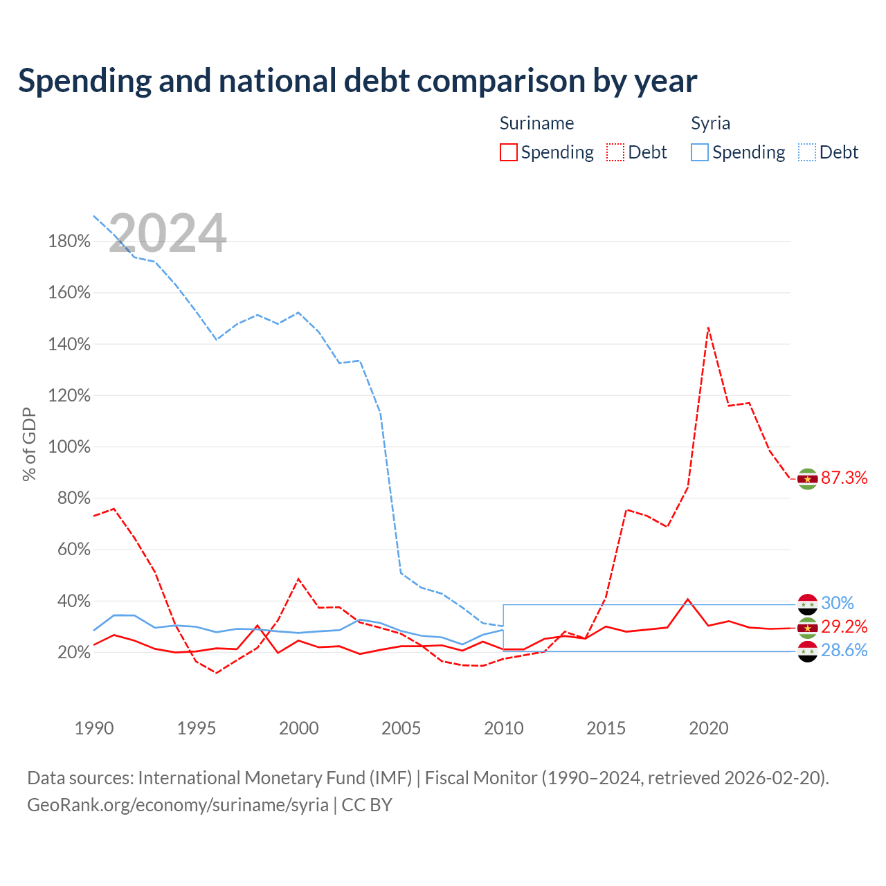 Suriname has $3.86B in government debt (87.3% of GDP), compared to $18.4B (30% of GDP) in Syria.