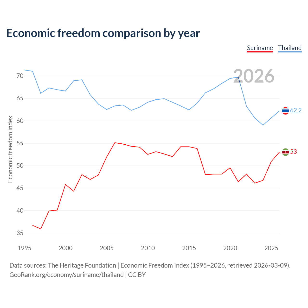 The Economic Freedom Index for Suriname is 53, ranking 143/197, compared to 62.2 for Thailand, ranking 88/197. The chart above displays a comparison of annual changes in economic freedom indexes.