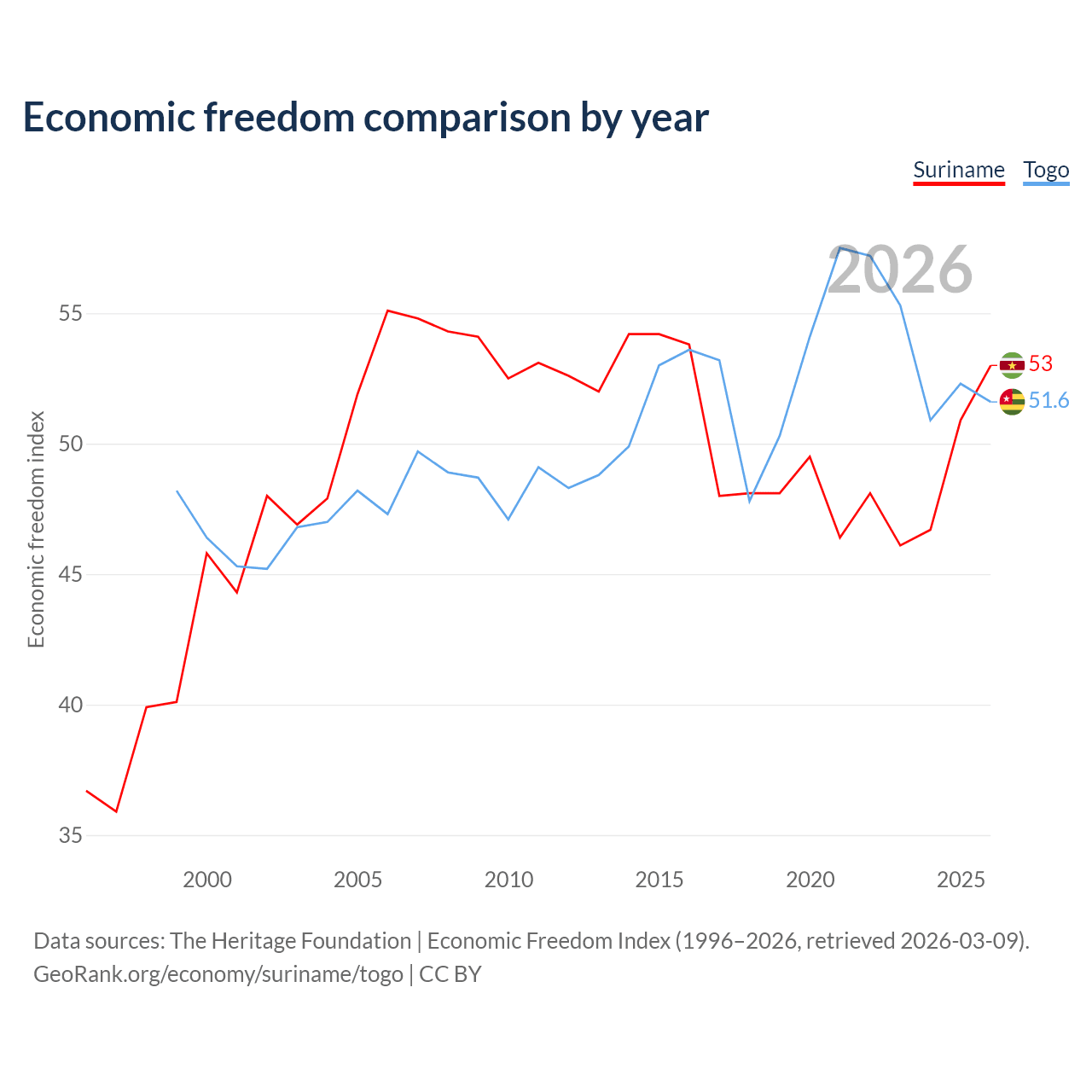 The Economic Freedom Index for Suriname is 53, ranking 143/197, compared to 51.6 for Togo, ranking 153/197. The chart above displays a comparison of annual changes in economic freedom indexes.