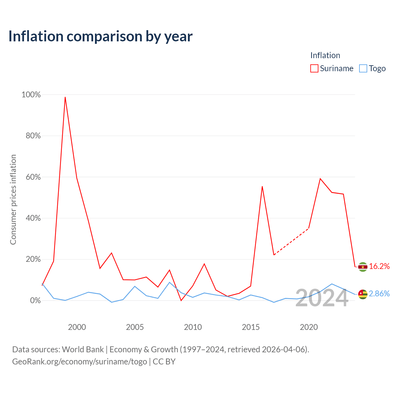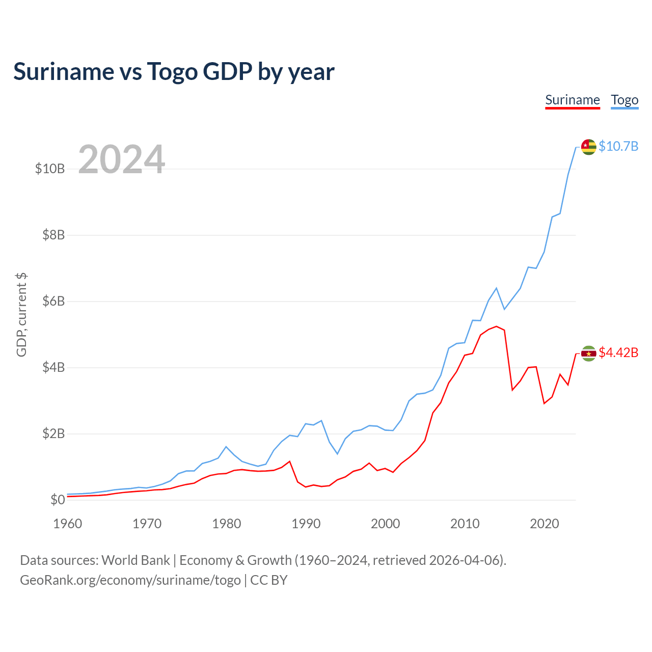 Suriname has a GDP of $4.42B compared to $10.7B for Togo, ranking 164/197 and 154/197 by economy size, respectively.