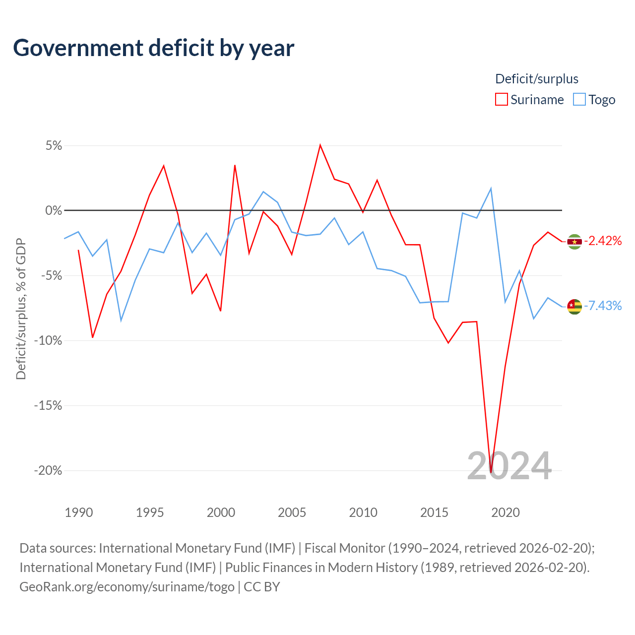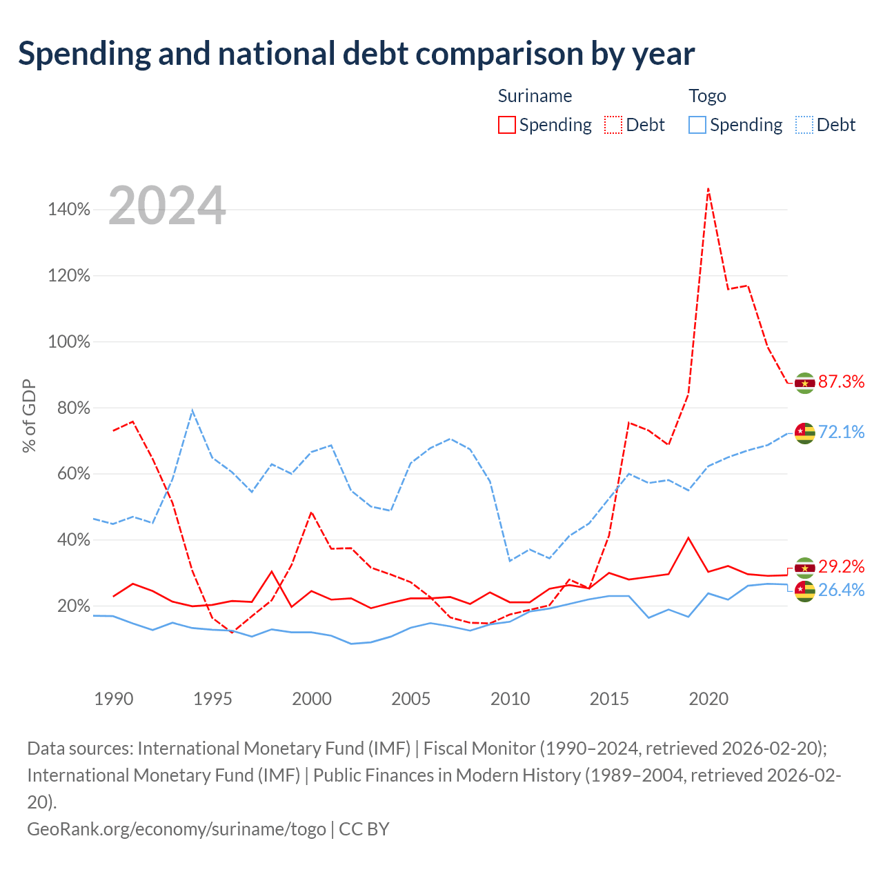 Suriname has $3.86B in government debt (87.3% of GDP), compared to $7.68B (72.1% of GDP) in Togo.