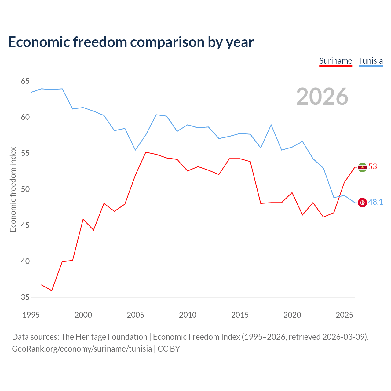 The Economic Freedom Index for Suriname is 53, ranking 143/197, compared to 48.1 for Tunisia, ranking 172/197. The chart above displays a comparison of annual changes in economic freedom indexes.