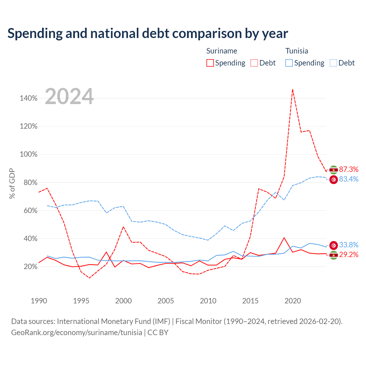 Suriname has $3.86B in government debt (87.3% of GDP), compared to $42.8B (83.4% of GDP) in Tunisia.