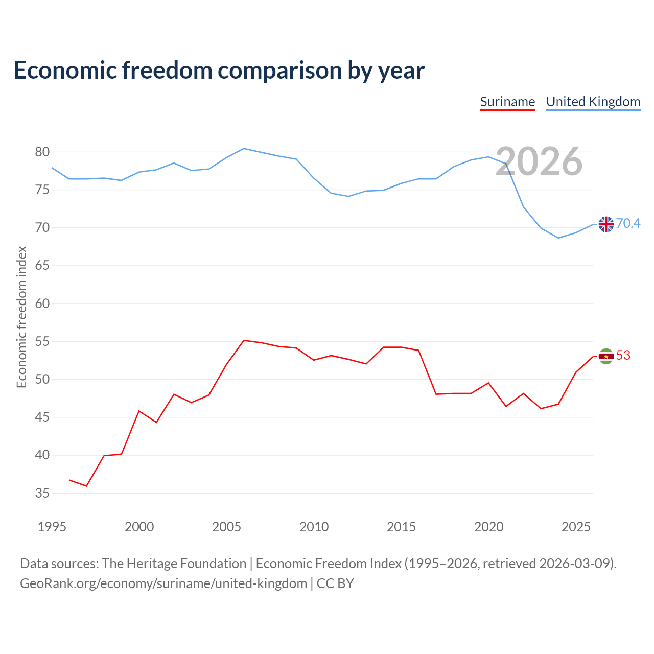 The Economic Freedom Index for Suriname is 53, ranking 143/197, compared to 70.4 for the United Kingdom, ranking 35/197. The chart above displays a comparison of annual changes in economic freedom indexes.