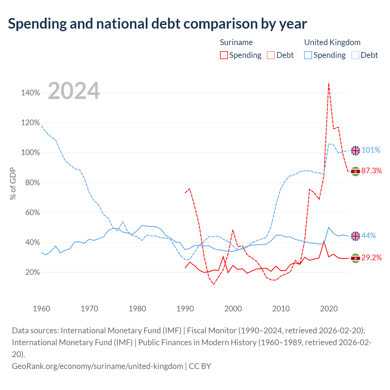 Suriname has $3.86B in government debt (87.3% of GDP), compared to $3.73T (101.2% of GDP) in the United Kingdom.
