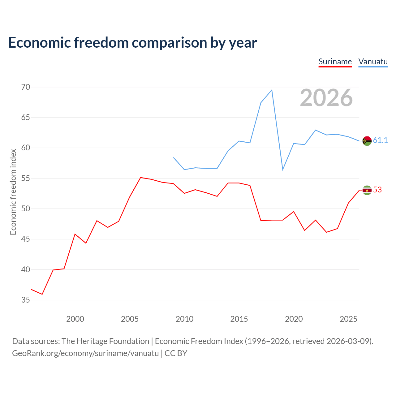 The Economic Freedom Index for Suriname is 53, ranking 143/197, compared to 61.1 for Vanuatu, ranking 92/197. The chart above displays a comparison of annual changes in economic freedom indexes.