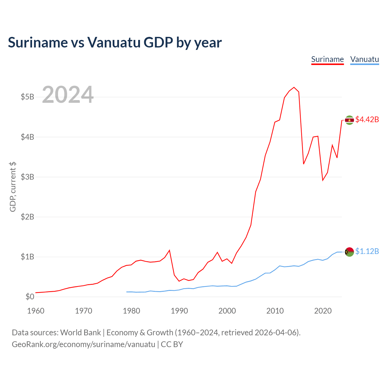 Suriname has a GDP of $4.42B compared to $1.12B for Vanuatu, ranking 164/197 and 188/197 by economy size, respectively.