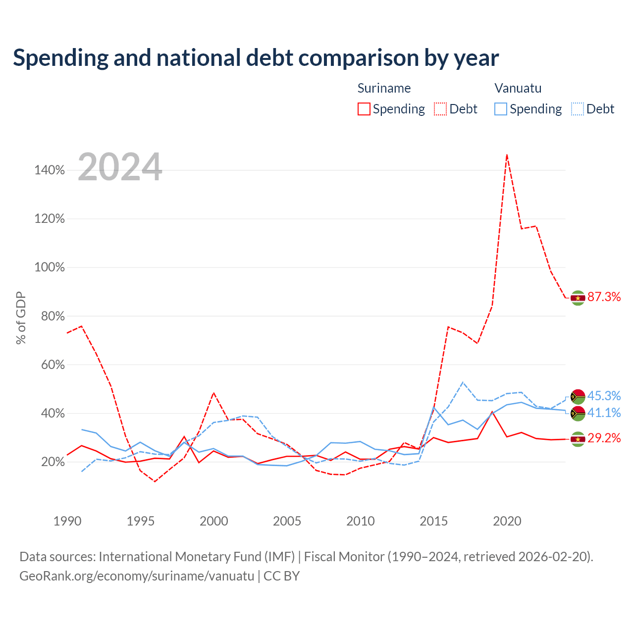Suriname has $3.86B in government debt (87.3% of GDP), compared to $507M (45.3% of GDP) in Vanuatu.