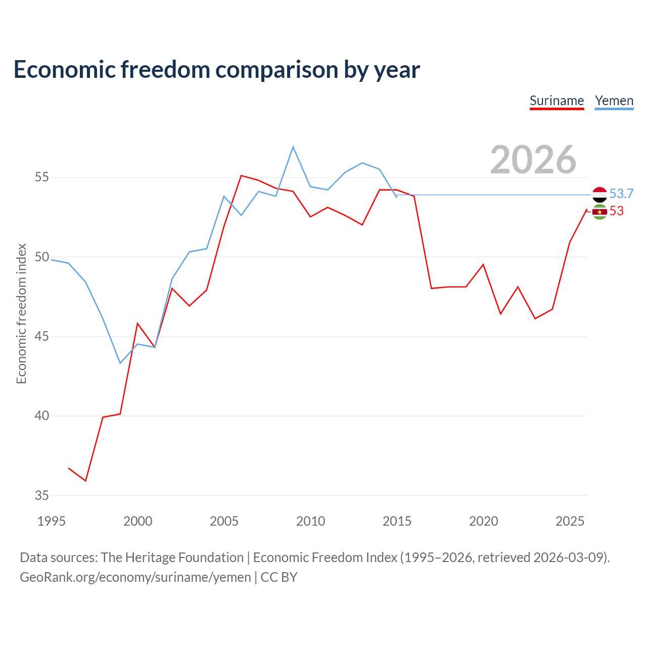 The Economic Freedom Index for Suriname is 53, ranking 143/197, compared to 53.7 for Yemen, ranking 138/197. The chart above displays a comparison of annual changes in economic freedom indexes.