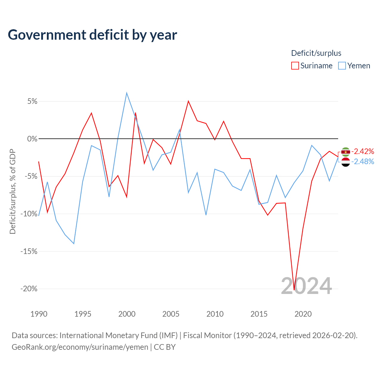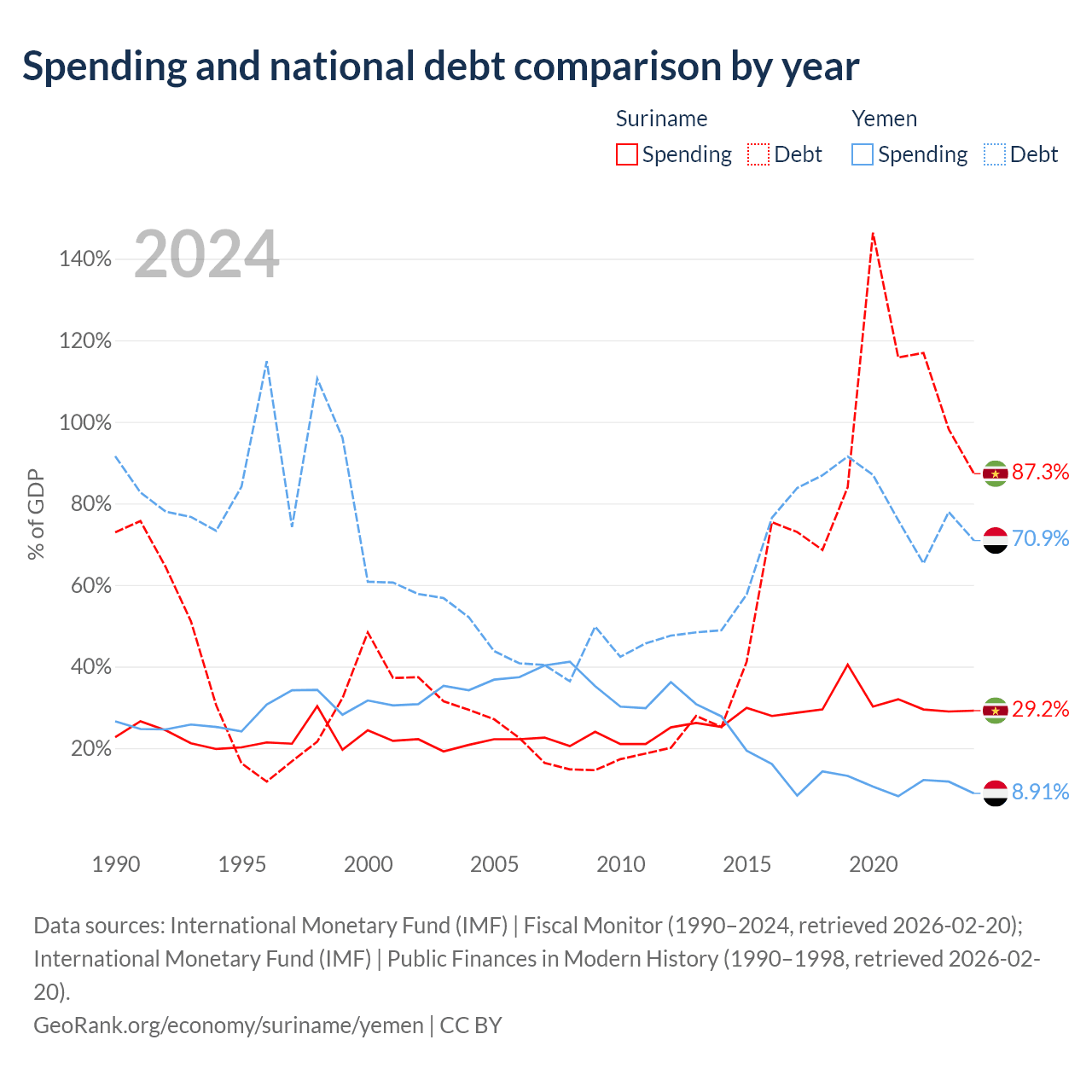 Suriname has $3.86B in government debt (87.3% of GDP), compared to $18.8B (70.9% of GDP) in Yemen.