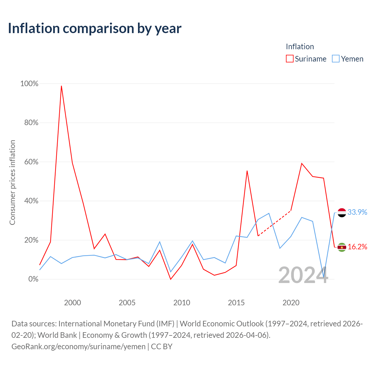 Suriname has a GDP of $4.42B compared to $21.6B for Yemen, ranking 164/197 and 125/197 by economy size, respectively.