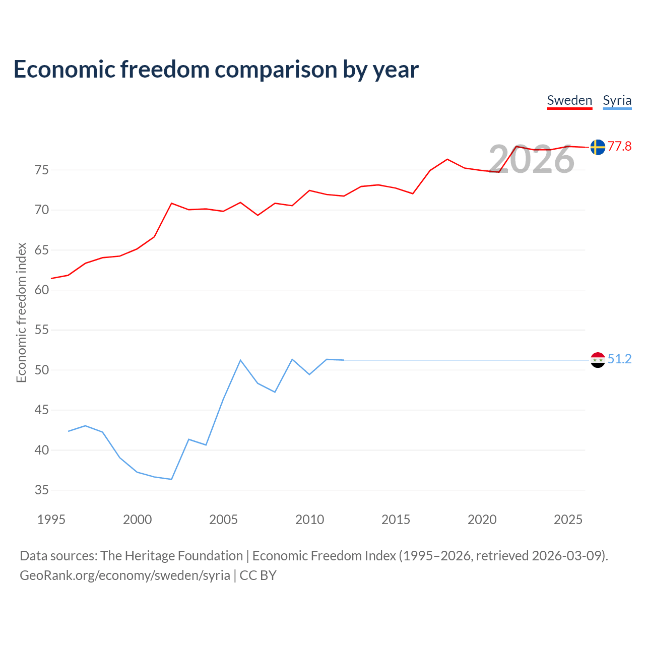 The Economic Freedom Index for Sweden is 77.8, ranking 14/197, compared to 51.2 for Syria, ranking 155/197. The chart above displays a comparison of annual changes in economic freedom indexes.