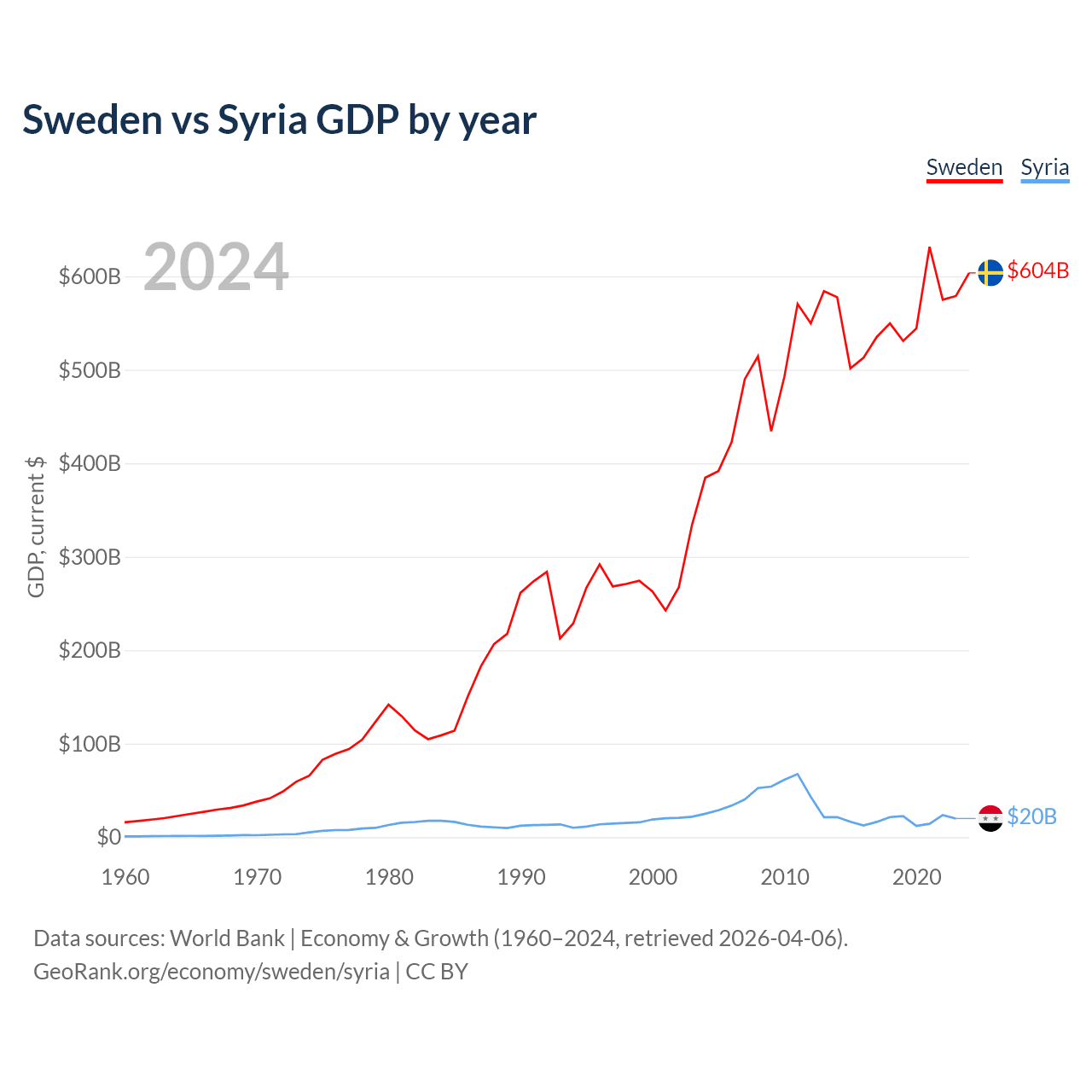 Sweden has a GDP of $604B compared to $20B for Syria, ranking 26/197 and 129/197 by economy size, respectively.